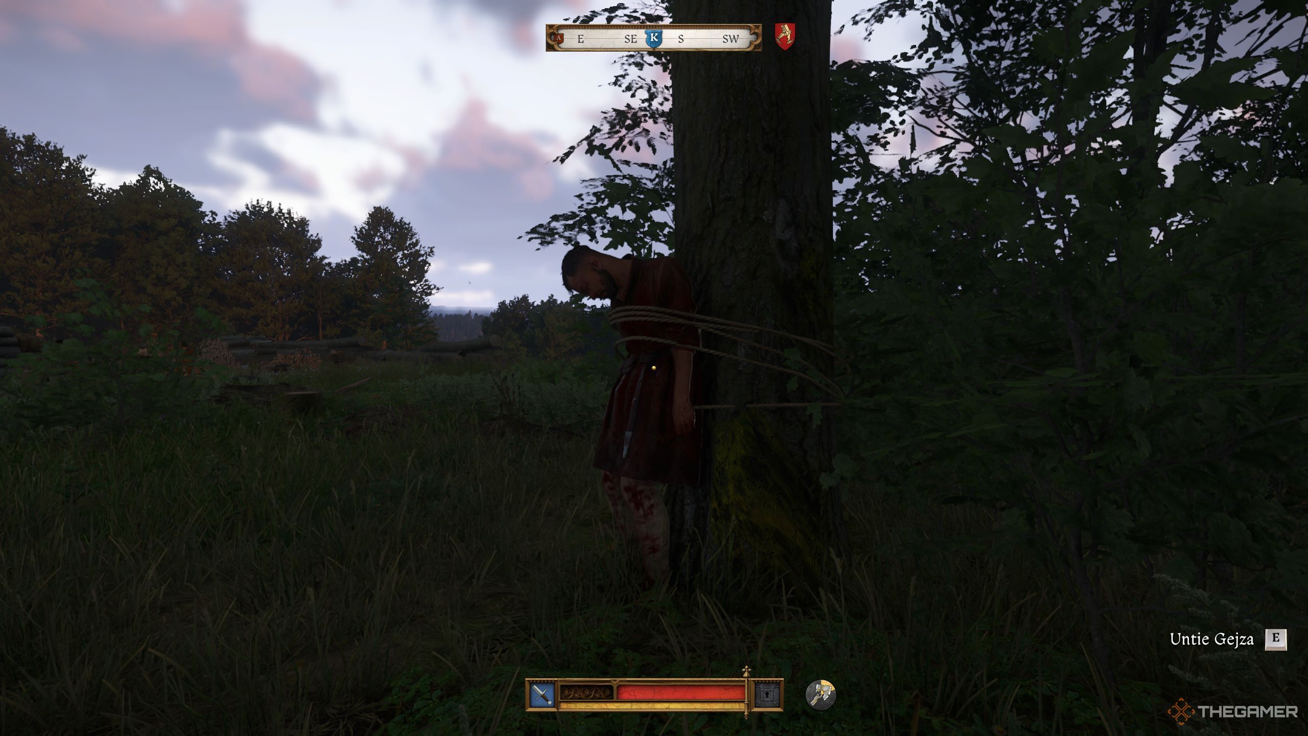 スキルチェックに成功すると、彼はあなたにゲジザの体を連れ去るように頼みます。ただし、失敗した場合は、ステルスアプローチを考慮する必要があります。北西側の木に縛られている体を見つけます。