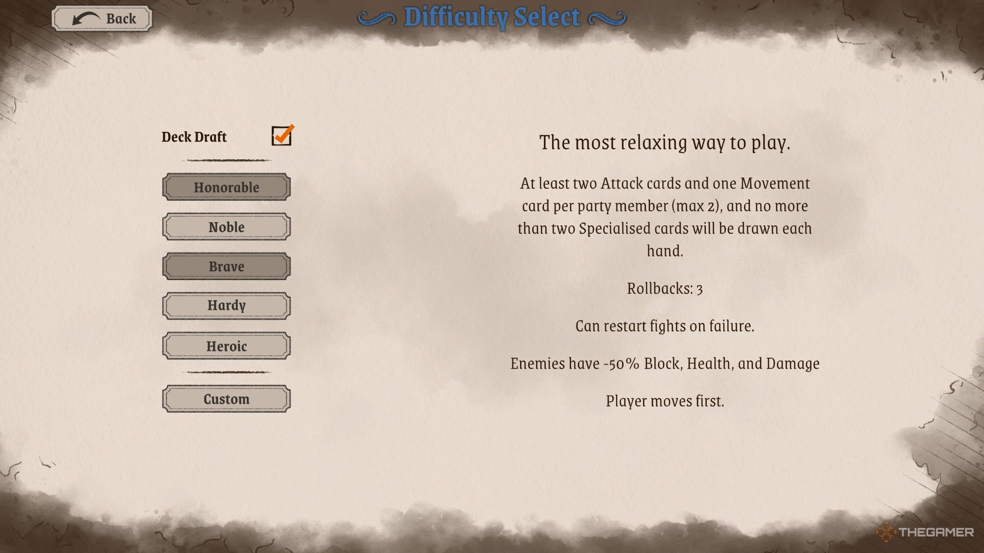 ストーリーモードの難易度を選択したら、「ドラフトデッキ」と書かれたリストの上部にあるチェックボックス。チェックされている場合は、選択したキャラクタークラスのスターティングデッキができるまで、3つのグループからカードを選択できます。あなたがそれを手に入れることができるなら、必ず少しの動き、攻撃、そしておそらく1、2ブロックを持ってください。
