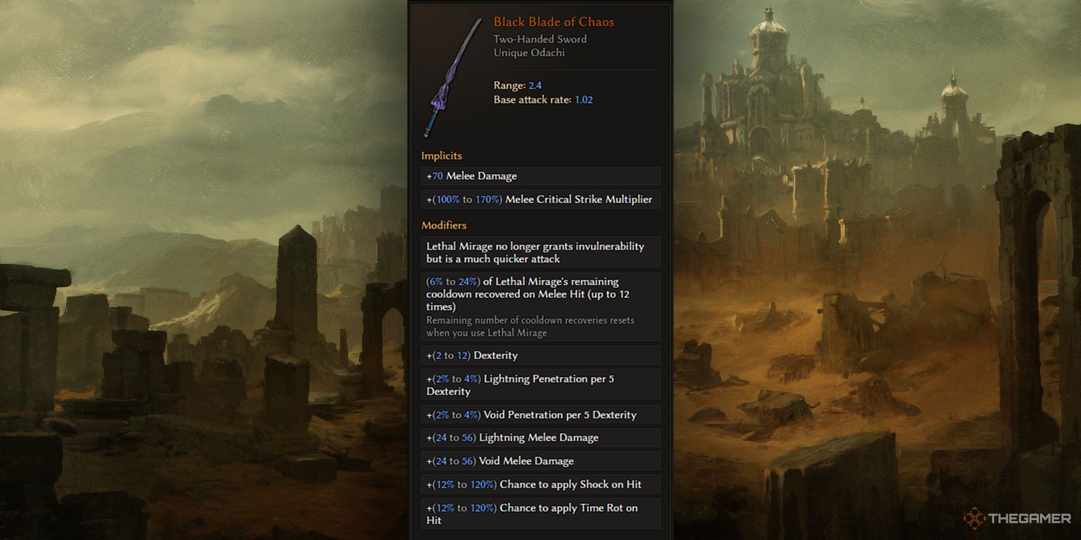 BladedancerはThe Rogueで最も人気のない習得であるかもしれませんが、ChaosのBlack Bladeは、クラスを仲間とは一線を画しています。このユニークな両手の剣は、特にそれを稲妻攻撃に変える衝撃的な把握ノードでアップグレードされた場合、致命的なミラージュの機能を改善します。