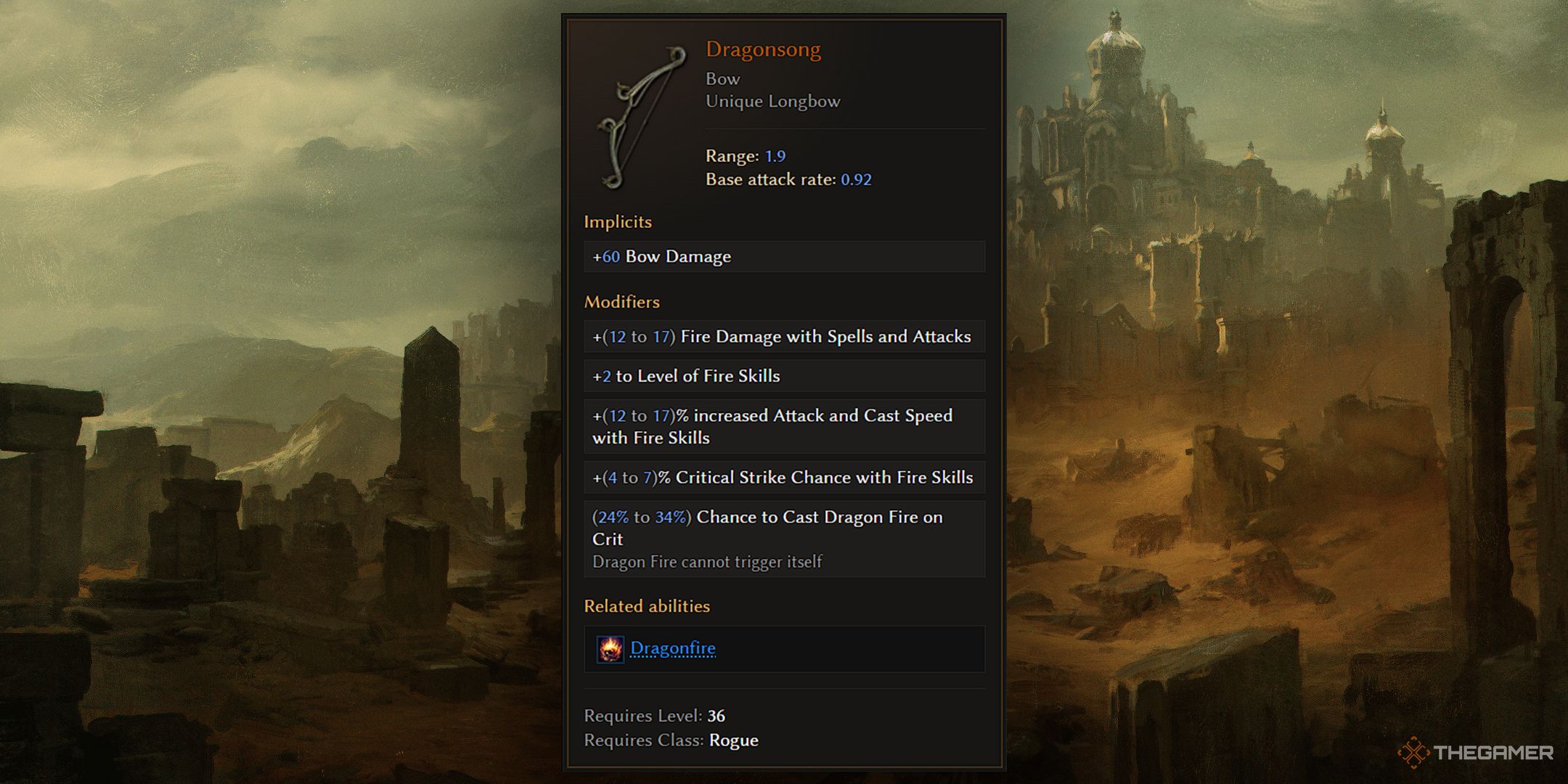 Dragonsongは、主に射撃者のために、火災の損傷に非常に強力な後押しを提供するユニークな弓です。その統計は、火災の損傷、火災のスキルによる攻撃速度、火災のスキルによる批判的なストライキのチャンス、さらにはすべての火のスキルのレベルさえ増加します。