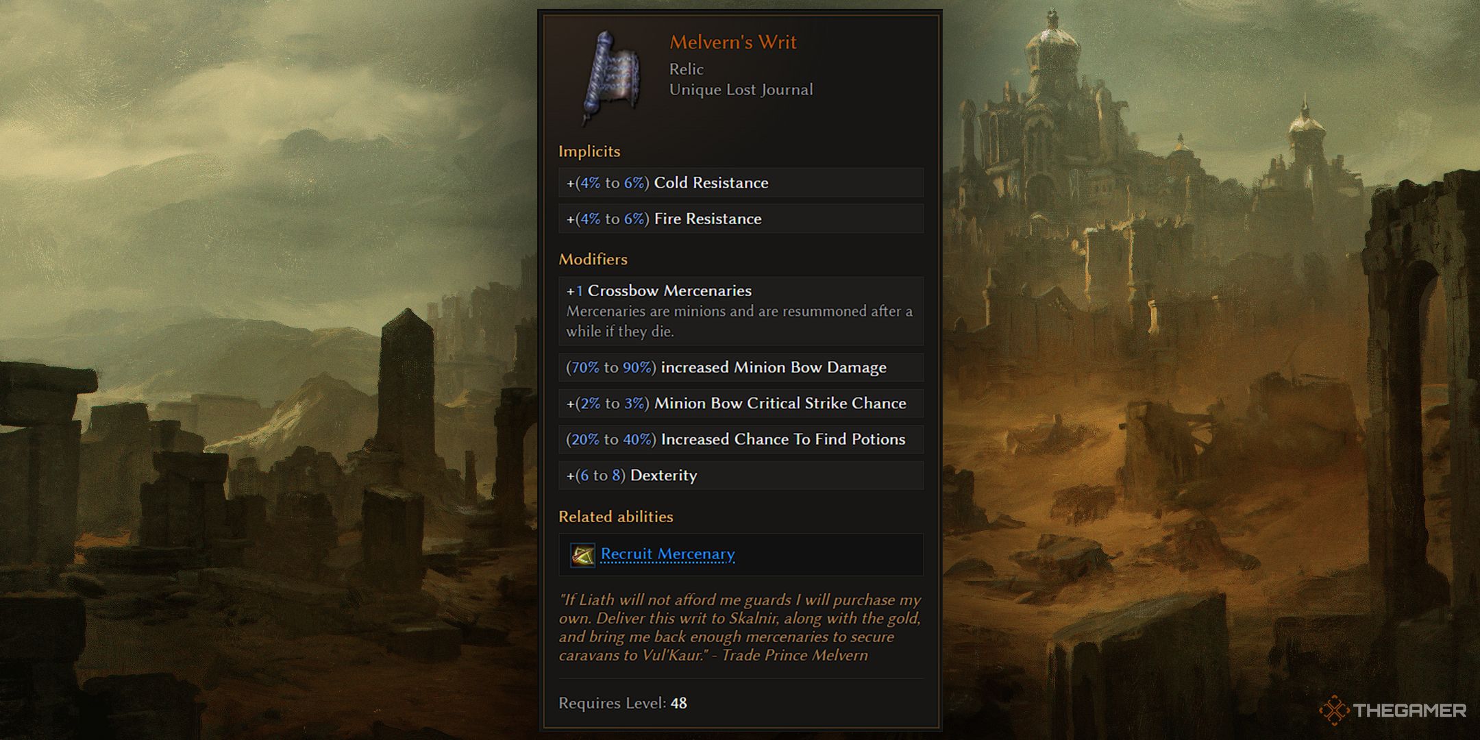 メルバーンの令状は、バリスタビルドにとってもう1つの素晴らしいオプションであり、ミニオンの弓損傷の増加とミニオン弓のクリティカルストライクチャンスを提供します。このユニークな遺物は、排他的なクロスボウのmerc兵も提供します。これは、死んでから数秒後に自動的に召喚されます。これらのmerc兵もミニオンと弓のタグを縮小するため、あなた自身のバリスタとほぼ同じくらい価値があります。