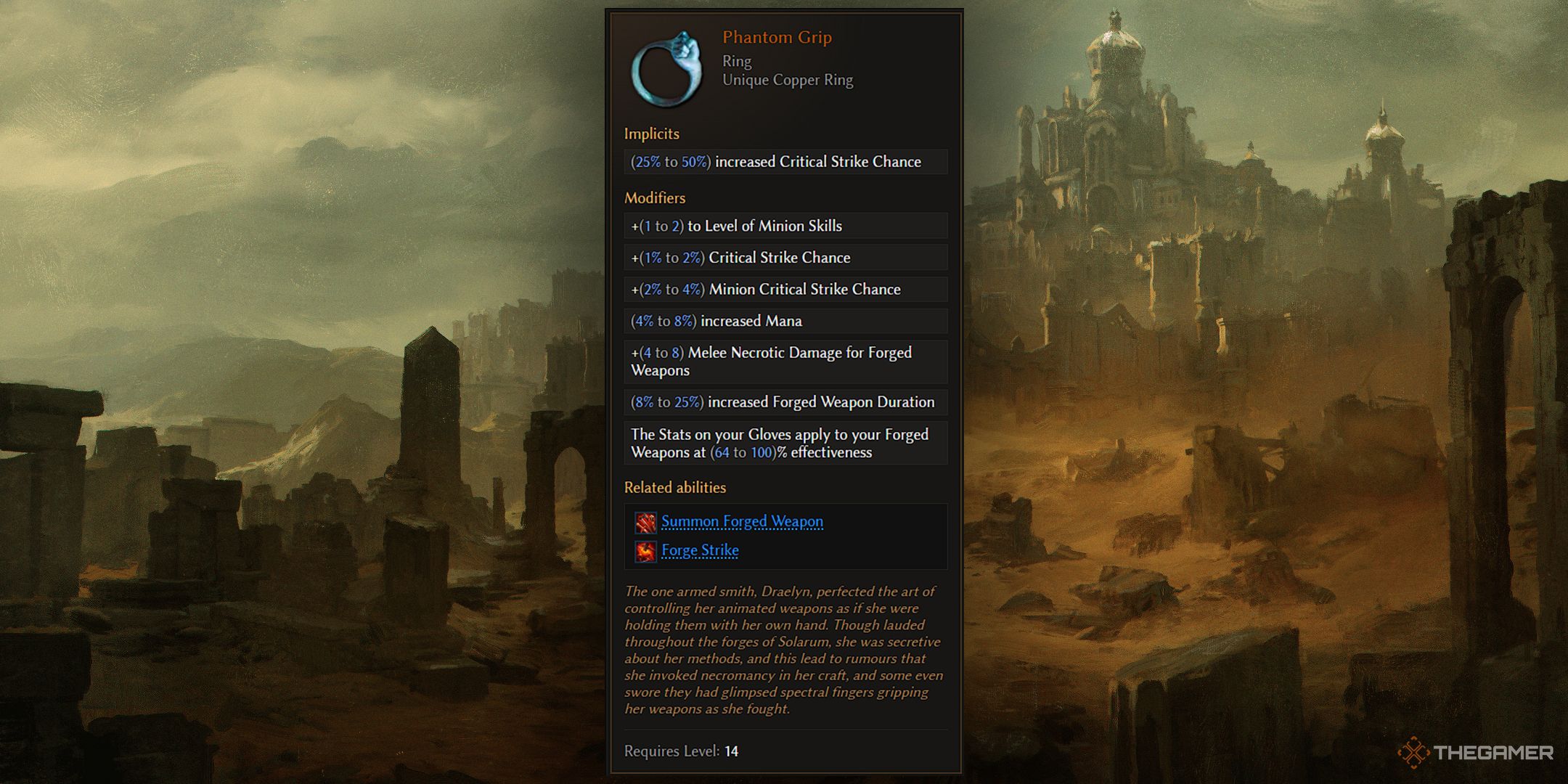 Phantom Gripは、Ballistaビルドだけでなく、ほとんどすべてのミニオンベースのビルド全般にとっても、もう1つの信じられないほどのユニークです。 Phantom Gripは、主にForge Guardを対象としていますが、Minion Skillレベルの増加とミニオンのクリティカルストライクチャンスのため、あらゆるタイプの手下とうまく機能します。