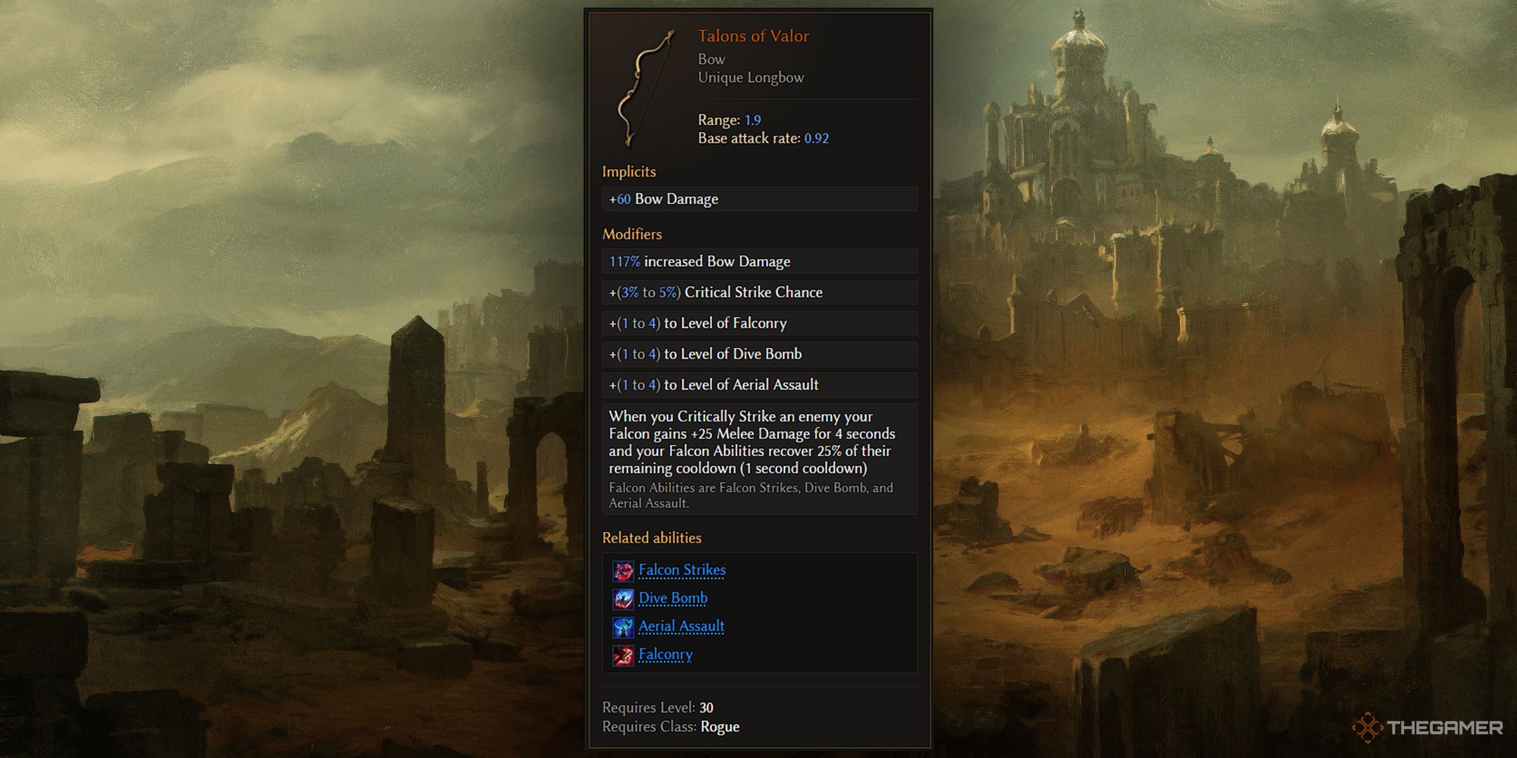 Talons of Valorは、ファルコナービルドに使用されるユニークな弓です。勇気のタロンは非常に高い平らな弓の損傷を提供するだけでなく、鷹狩り、爆弾、空中攻撃のスキルレベルを上げて、これらのスキルの木からさらに多くを得ることができます。