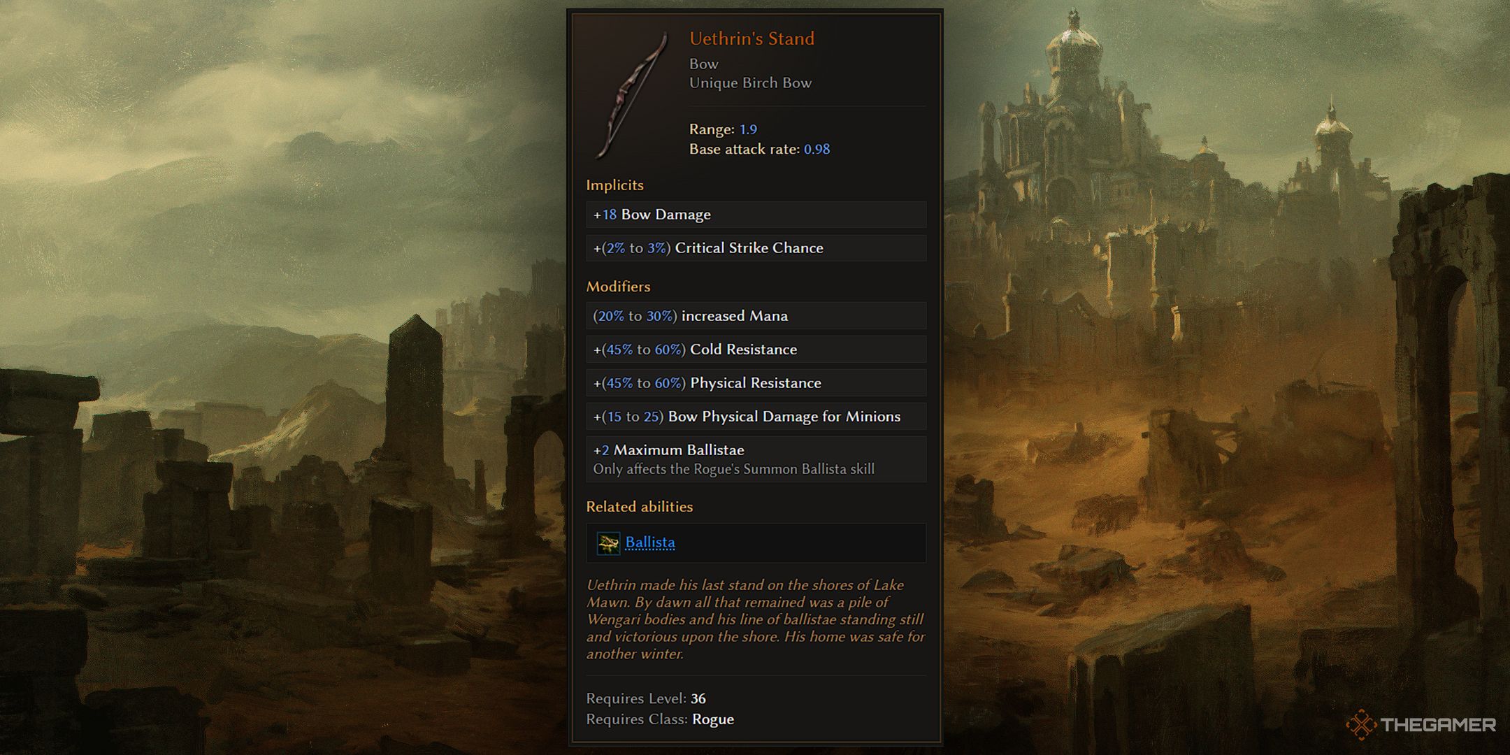 Uethrin's Standは、Ballistaeを使用するあらゆるビルドのためのスロットのベスト武器です。この弓は、追加の弓の損傷と重大なストライキの機会を提供する大きなインクリッツを持っているだけでなく、その修飾子がバリスタを含む手下の弓の物理的損傷を改善します。