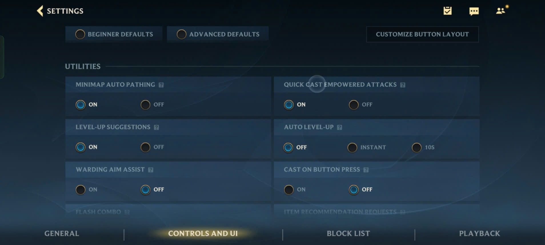 クイックキャストの権限を与えられた攻撃 | オプション | これは非常に物議を醸す設定であるため、あなたに大きく依存します。有効にすると、Jax、Garen、RengarのようなチャンピオンがWillになります範囲内であらゆるものにすぐに究極を使用します。それには含まれますミニオンやハニーフルーツ敵の代わりに。クイックキャストの権限を与えられた攻撃はそうですレンガーにとって特に問題があります、これは最も苦しんでいるチャンピオンだからです。それは両刃のナイフです:迅速な実行に最適ですが、敵が範囲外である場合は危険です。 |