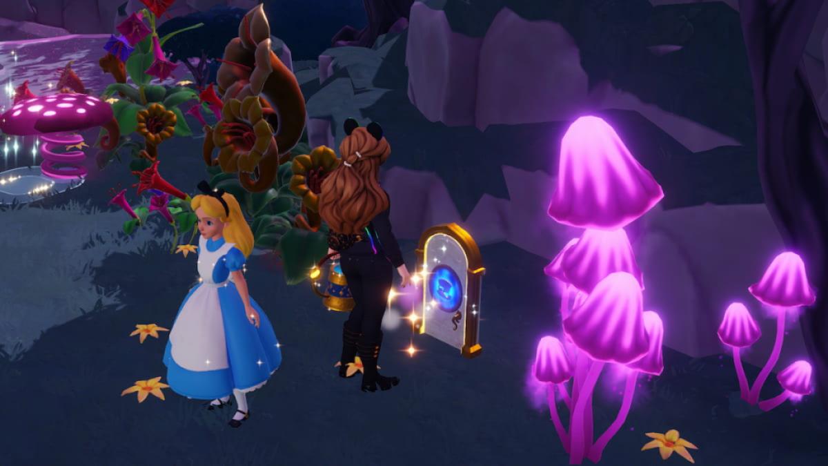 アリスに続いて領域の入り口に戻って、クラフトベンチとキャンプファイヤーの近くに4つの色のマッシュルームが気付くでしょう。 4つのオプションがありますが、アクティブにするだけですピンクと青のキノコアリスとチェシャーの猫を代表する。アリスには青いドレスがあり、チェシャーの猫はピンクです。