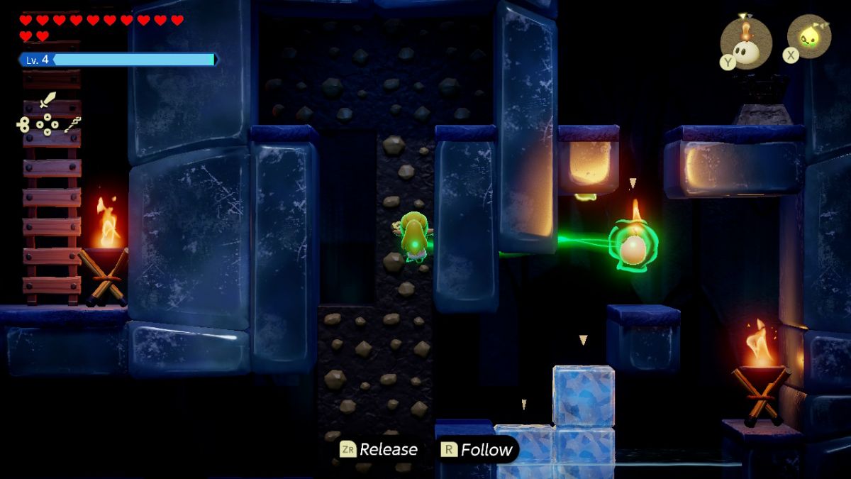 どちらかで水を横切る必要がありますクラウドまたはアイスブロックエコー火のシンボルを右の台座から左の空の台座に結合します。これによりトラックがアクティブになり、壁が後ろに移動してはしごを発表します。 2Dルームを通り抜けて、Strandtula Echoを使用して、3つのモンスターの牙を含む宝箱をつかみます。