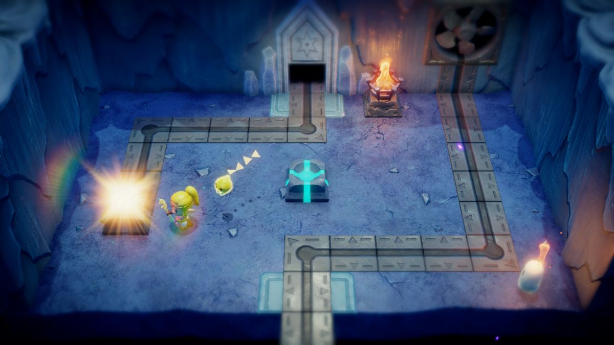 先に進む前に、部屋のすべての火鉢を照らす必要があります。つららを溶かし、イグニゾールエコーを使用して火山に火をつけます。北東の火山はあなたに必要ですイグニゾールを壁に結合しますそれを照らすために、そして同じことが南部の火山病でもできます。南に登る前に、北西部に100ルピーを含む宝箱にウォーターブロックのトレイルを作ってください。