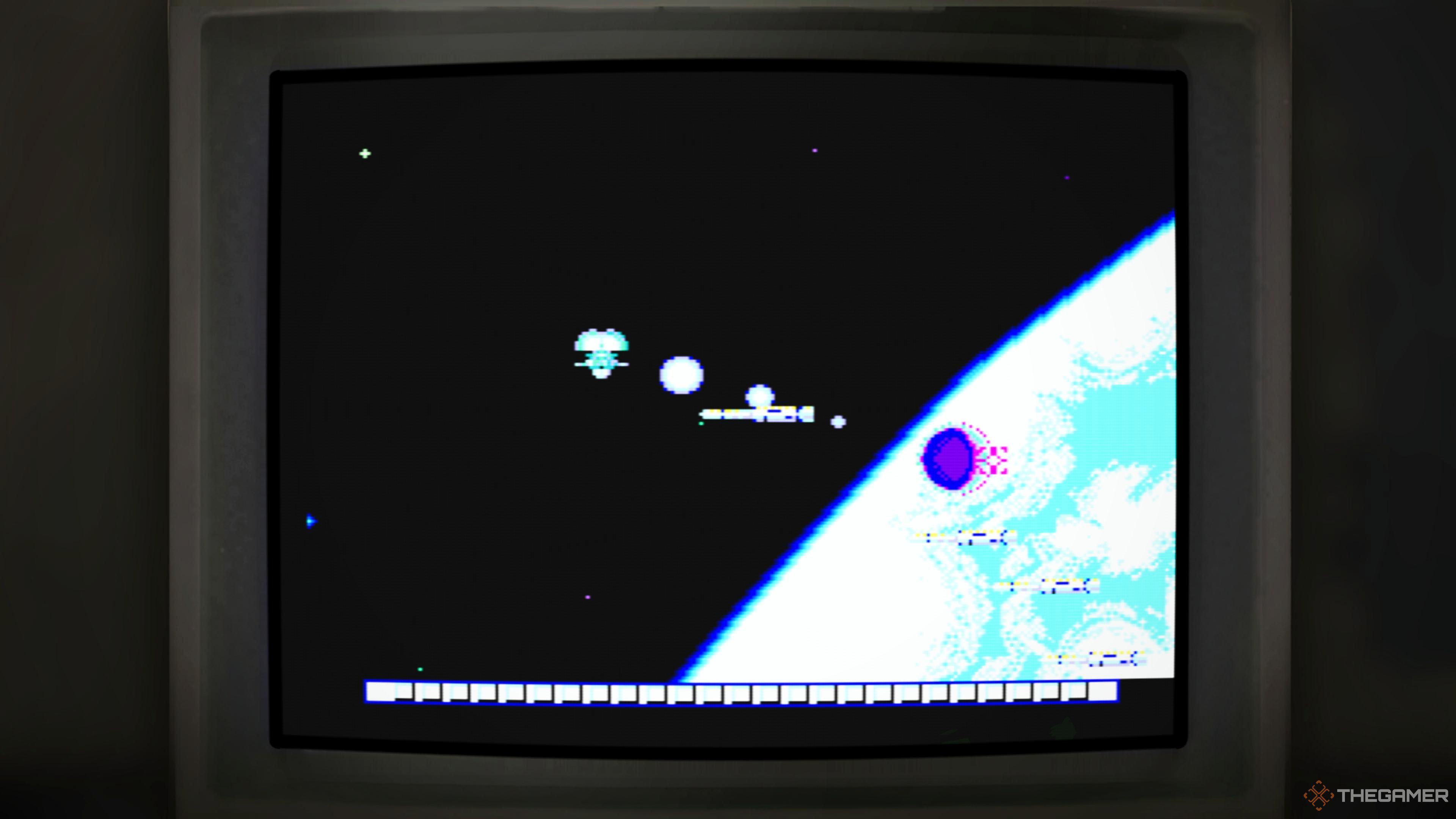 グローバル防衛には、衛星を撃ち、移動するために使用する十字線があります。コレクションで最も難しいゲームの1つです。なぜなら、動くには、スティックが動作するためのボタンを保持する必要があるからです。また、破壊できない敵の火があります。あなたはそれを回避することしかできません。