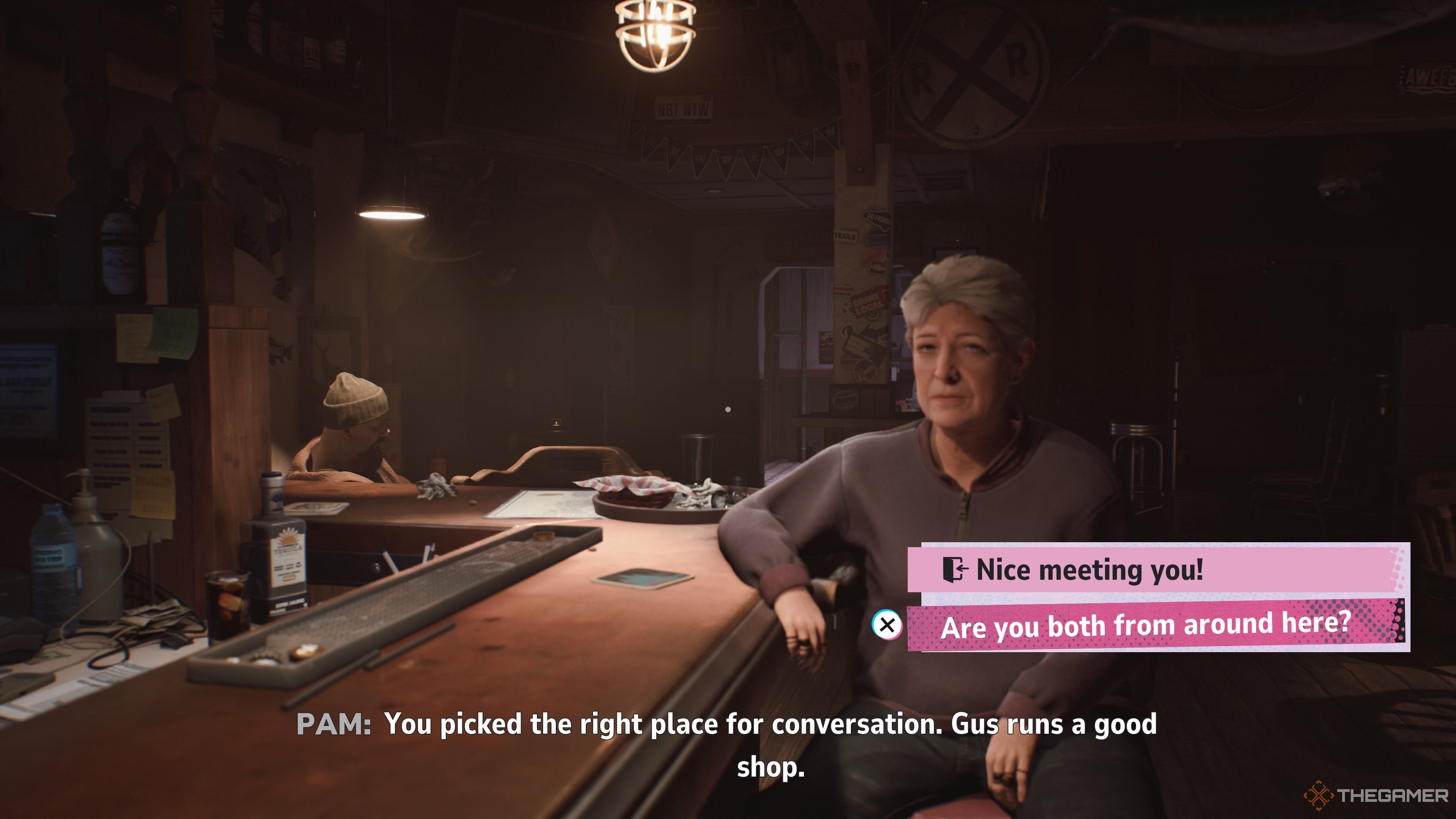 2022年には、スワンと秋の飲み物が準備ができています。今すぐ支払うか、タブを開くことはどちらも中立的な選択です。すぐに、パムという名前の女性が歩いて行き、スワンを会話に参加させようとします。この会話の各段階で滞在してチャットしたり、辞めることができます。