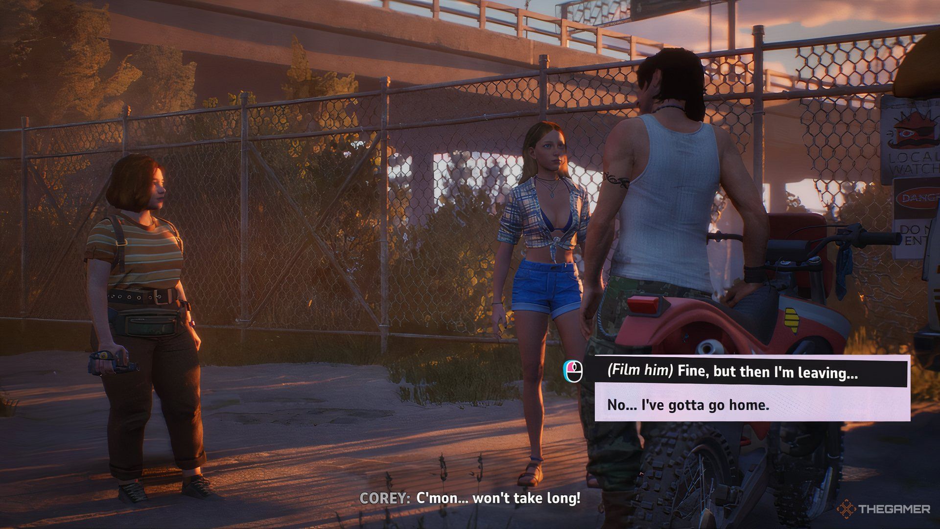 ディランを撮影することを選択すると、いじめっ子の回想録が解除されます。これはオプションですので、あなたがそれを求めているなら、カメラで彼女をつかむようにしてください。あなたが選んだものに関係なく、コーリーは彼のバイクに入っています。あなたがディランを撮影した場合、彼女はあなたが彼女に嫌がらせをしていると言います。