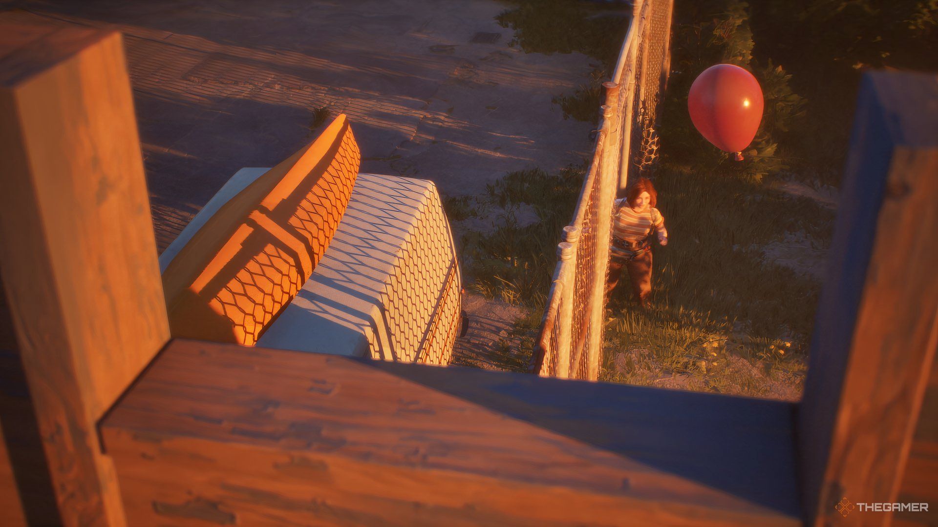 しばらくして、スワンは彼女が遅れていることに気づきますフェンスを取ることにしました(映画宮殿の左側)家に帰るショートカット。バルーンが彼女の道に現れ、あなたはそれを撮影するためにそれを撮影する必要があります。また、にカウントされます所定の回想録に移動します。