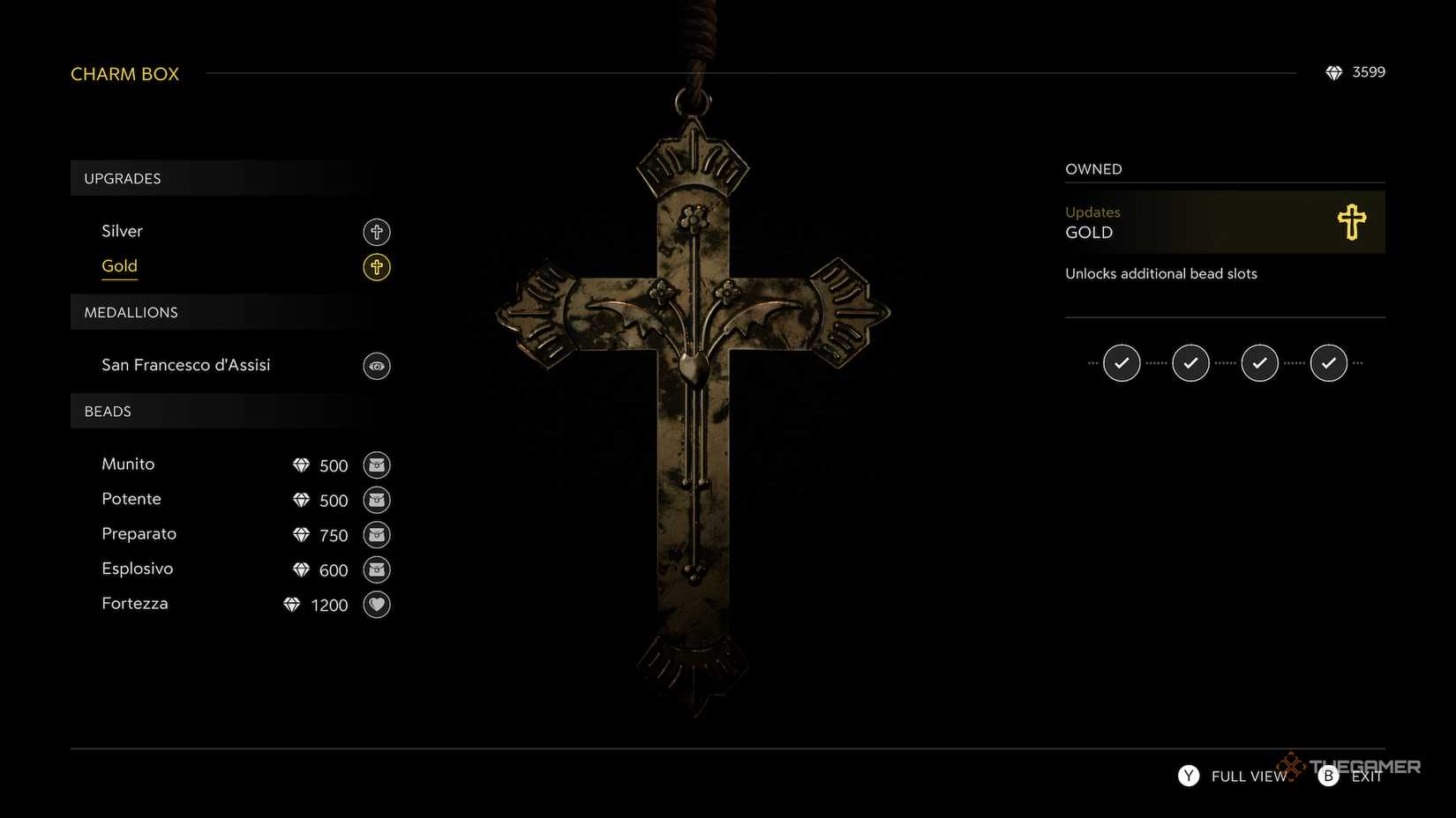 店に着いたら、見つけることができます十字架のアイコンによって強調されている小さな神社。これとやり取りすることで、できます銀と金の十字架のアップグレードを購入します、追加のビーズスロットを提供します。つまり、できることを意味します余分なチャームを装備します。