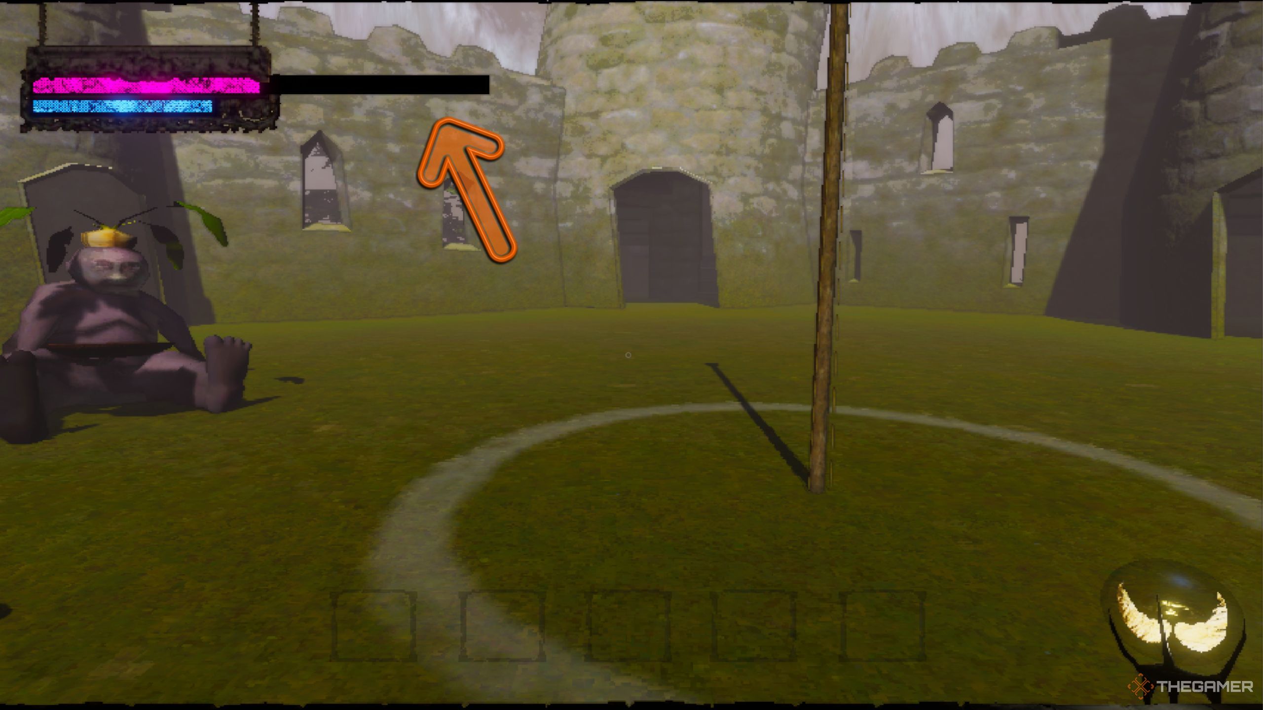 友達と集まったり、Mage Arenaのランダムなゲームに参加したら、ベースタワーにスポーンします。これは本質的にドアといくつかのアイテムがある大きな部屋です。この部屋では、木の樹皮の近くに巨大な姿が座っているのが見えます。この数字に近づくと、それと話すオプションが与えられます。