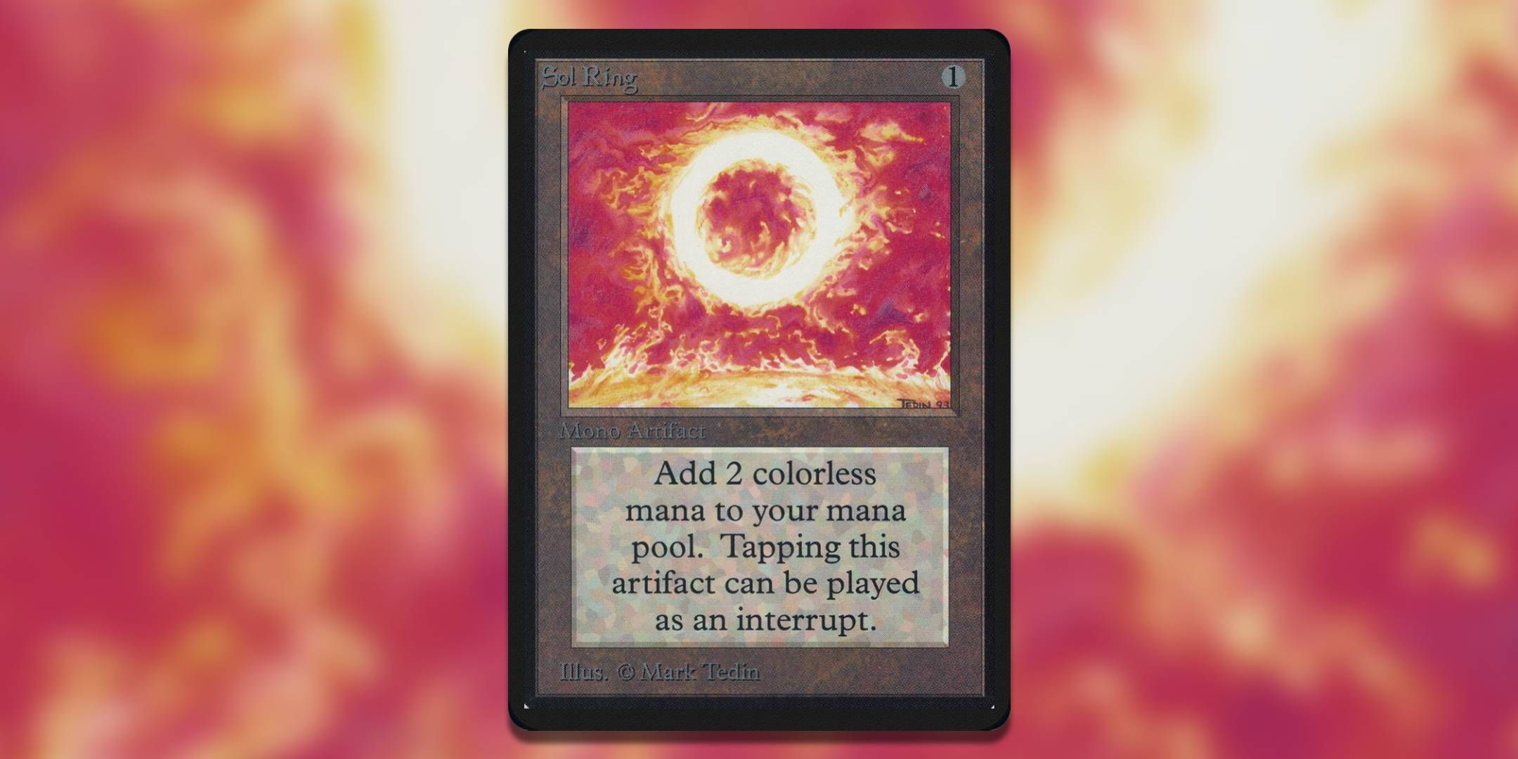 アルファソルリングには、マークテディンがカード用に作成したジャッジプロモーションバージョンと同じアートワークがあります。後の解釈では、ソルリングが物理的なアイテムまたは魔法のオブジェクトであることを示していますが、テディンは名前を心に留め、よりエスレアルバージョンのソルリングを火のリングにしました。