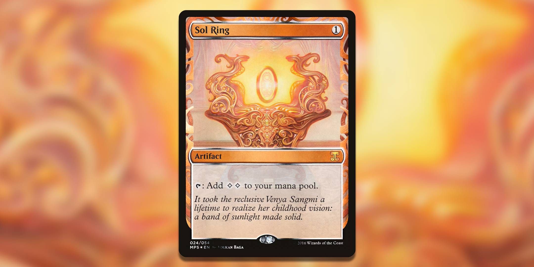 ここのソルリングは、黄金のスタンドの上に浮かぶ輝くリングとして描かれています。発明はすべて特別な境界線を共有し、フィリグリーの金属は通常のアーティファクトフレームに取って代わります。他の飛行機の職人によって作られているソルリングの解釈は、魔法の飛行機の文化と多様性を認識できるカードであることを示す素晴らしい方法を与えます。