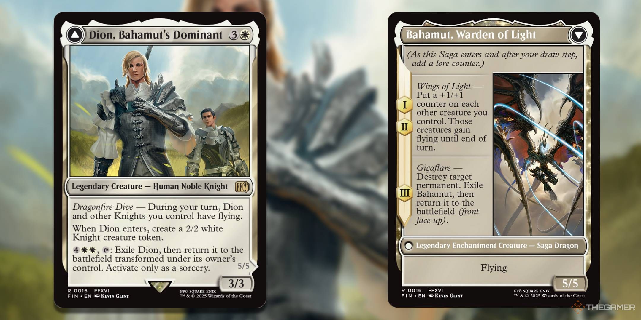 ディオン、バハムートのドミナントは、ファイナルファンタジーXVIの主人公の1人であり、カードを与えられた多くの名前のファイナルファンタジーキャラクターの1つは魔法:ギャザリングファイナルファンタジークロスオーバーセット。ディオンは、ナイトクリーチャータイプをサポートする高貴な騎士(ファイナルファンタジーXVIと、文字通り彼のマジックカードのクリーチャータイプ)です。