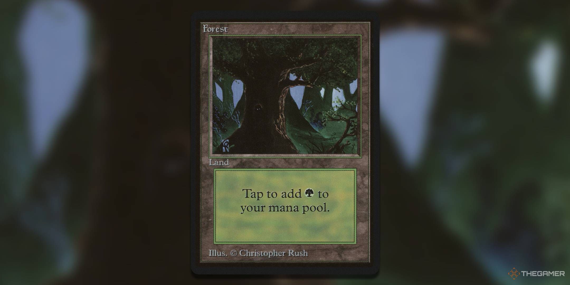 限定版ベータセットのこの図は、クリストファーラッシュによって行われ、非常に伝統的なファンタジーの森を描いています。大きな木がフレームの前面を支配し、その葉がイラストの上部に広がっています。その背後には、他の大きな木や岩が背景に影が付けられています。