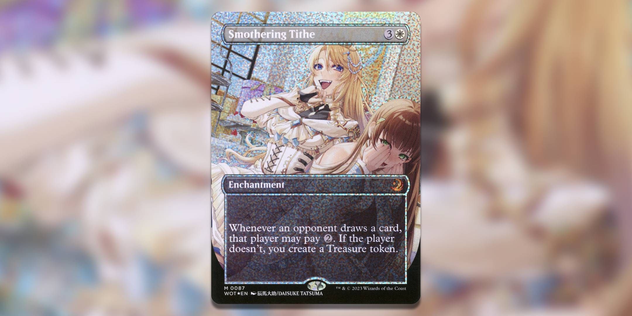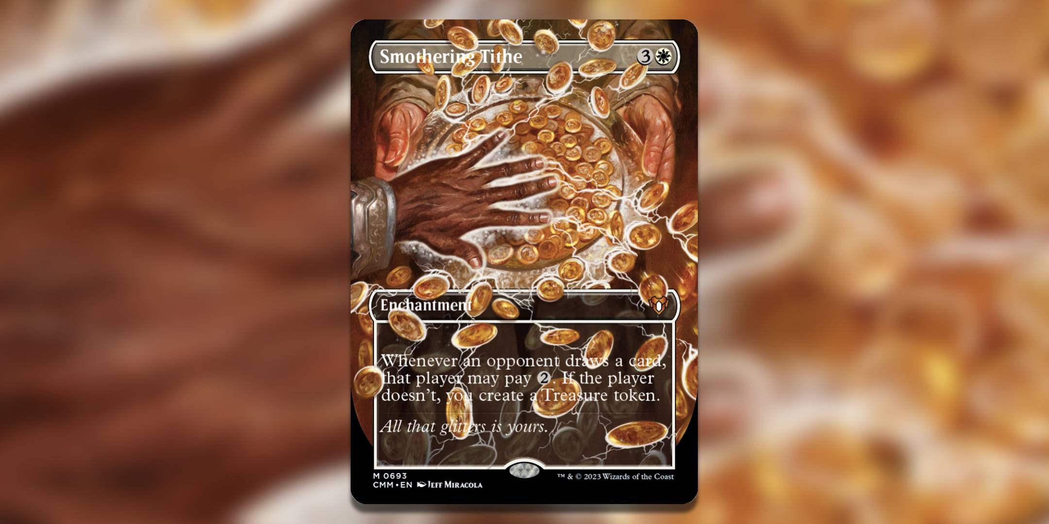 Smothering Titheは、2019年のRavnica Allegianceに最初に印刷され、すぐに人気のある司令官の定番になりました。ダブルマスターの印刷は、カードが数年後に受け取る最初の復刻版であり、カードの価格を下げるためにあまりしていませんが、さらに数枚のコピーを市場に注入するのに役立ちました。