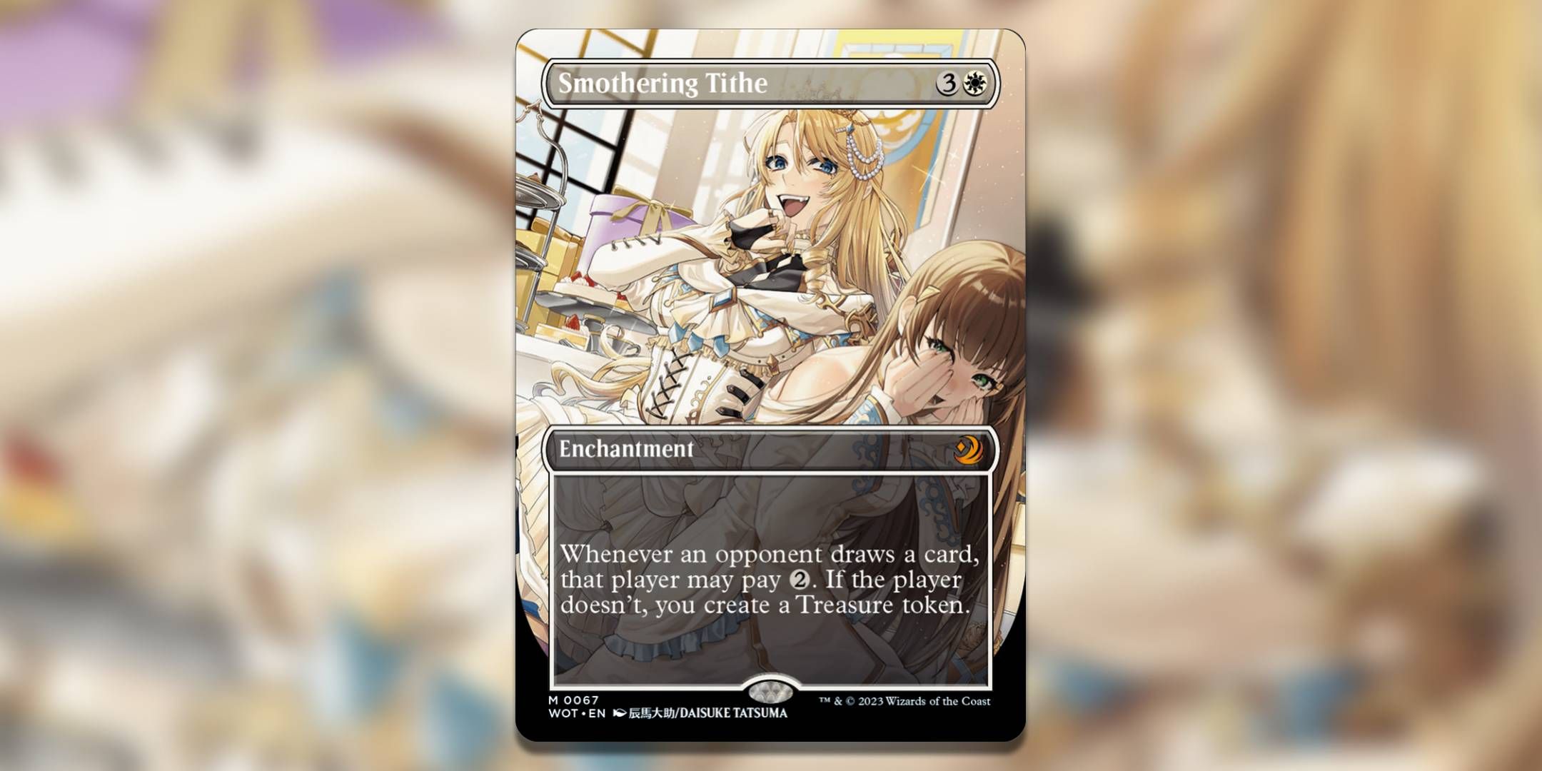 EldraineのWilds:Enchanting Tales Bonus SheetのSmothering Titheの別のコピーがこのリストの終わりに向かって来ますが、イラストレーターのShafer Brownのアートワークをフィーチャーしたこのカードは、まったく異なる雰囲気と外観を持っています。