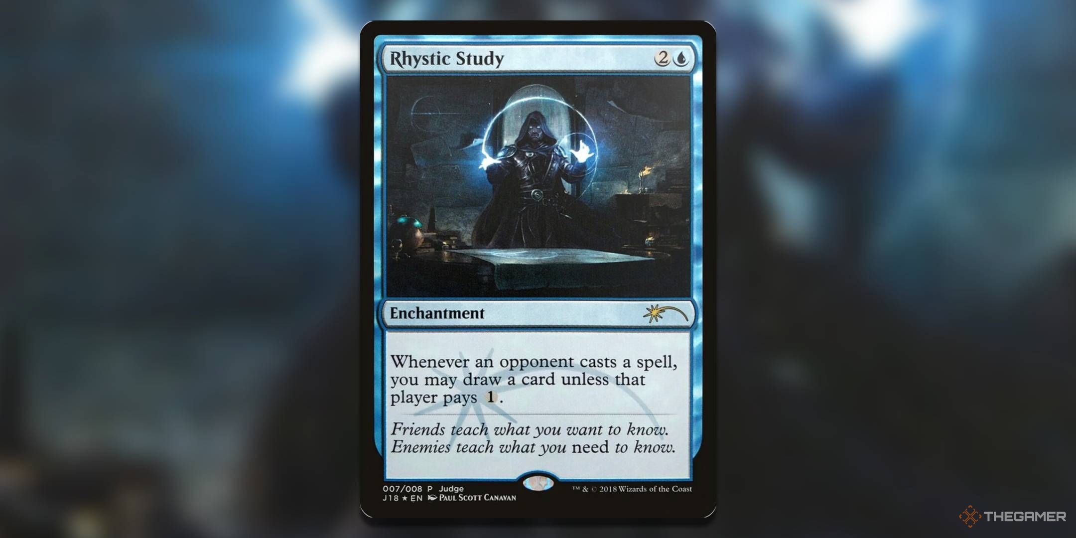 Paul Scott Canavanによるこのイラストは、暗い背景に呪文をかけるフード付きの姿を描いています。カードの引用は、敵が友達よりもあなたを教えることについてです。画像は、雰囲気が非常に不吉であるため、これが敵である可能性があることを示唆しています。