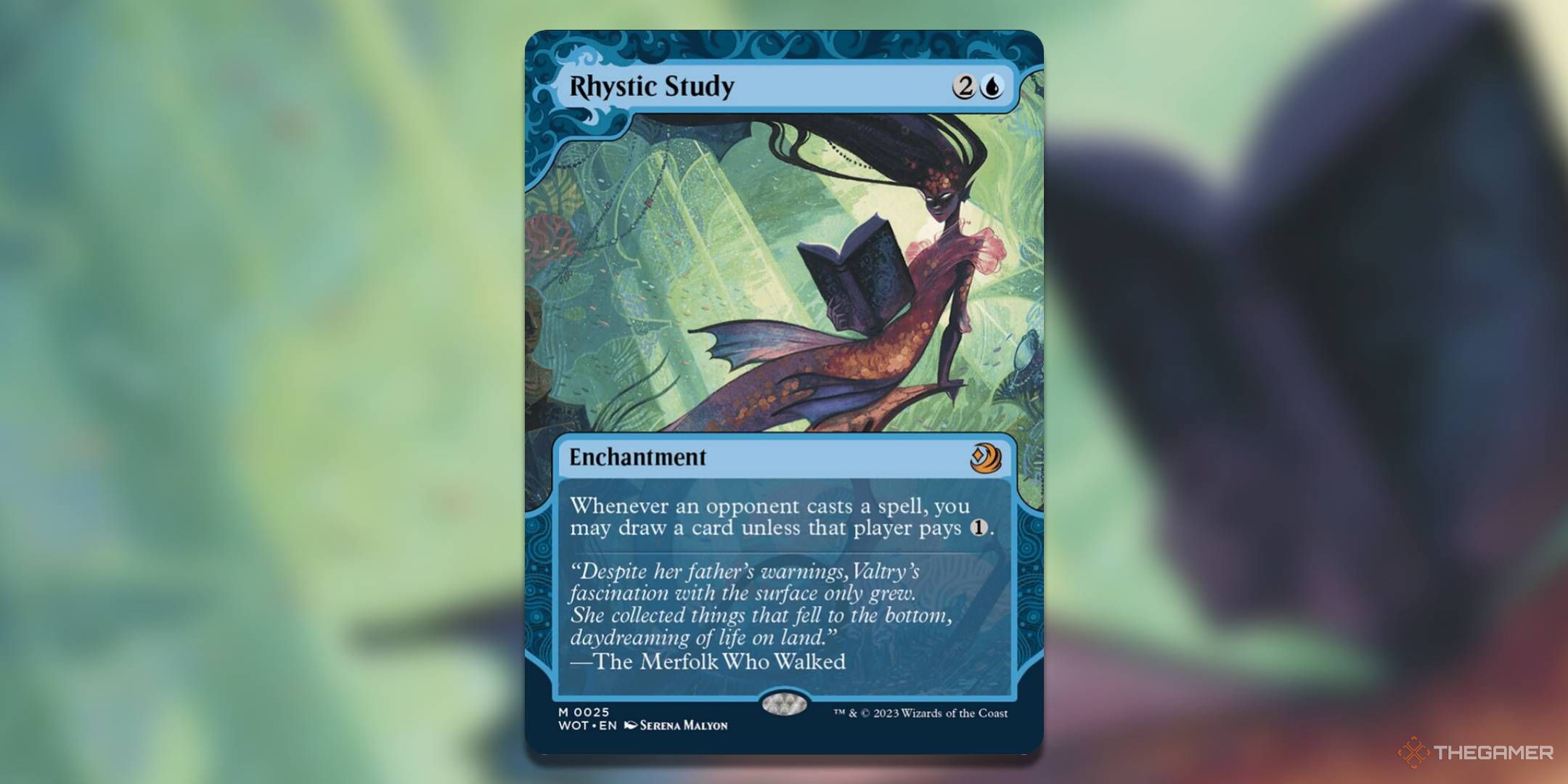 彼女は、Little MermaidのMTGSバージョン、歩いたMerfolkのイメージで熱心に勉強しています。水中の背景は、対照的なパステルと詳細な背景で驚くべきものです。水を通しての太陽は、アートワークが物語のテーマを呼び起こすように、土地を食欲をそそる垣間見ることを示しています。
