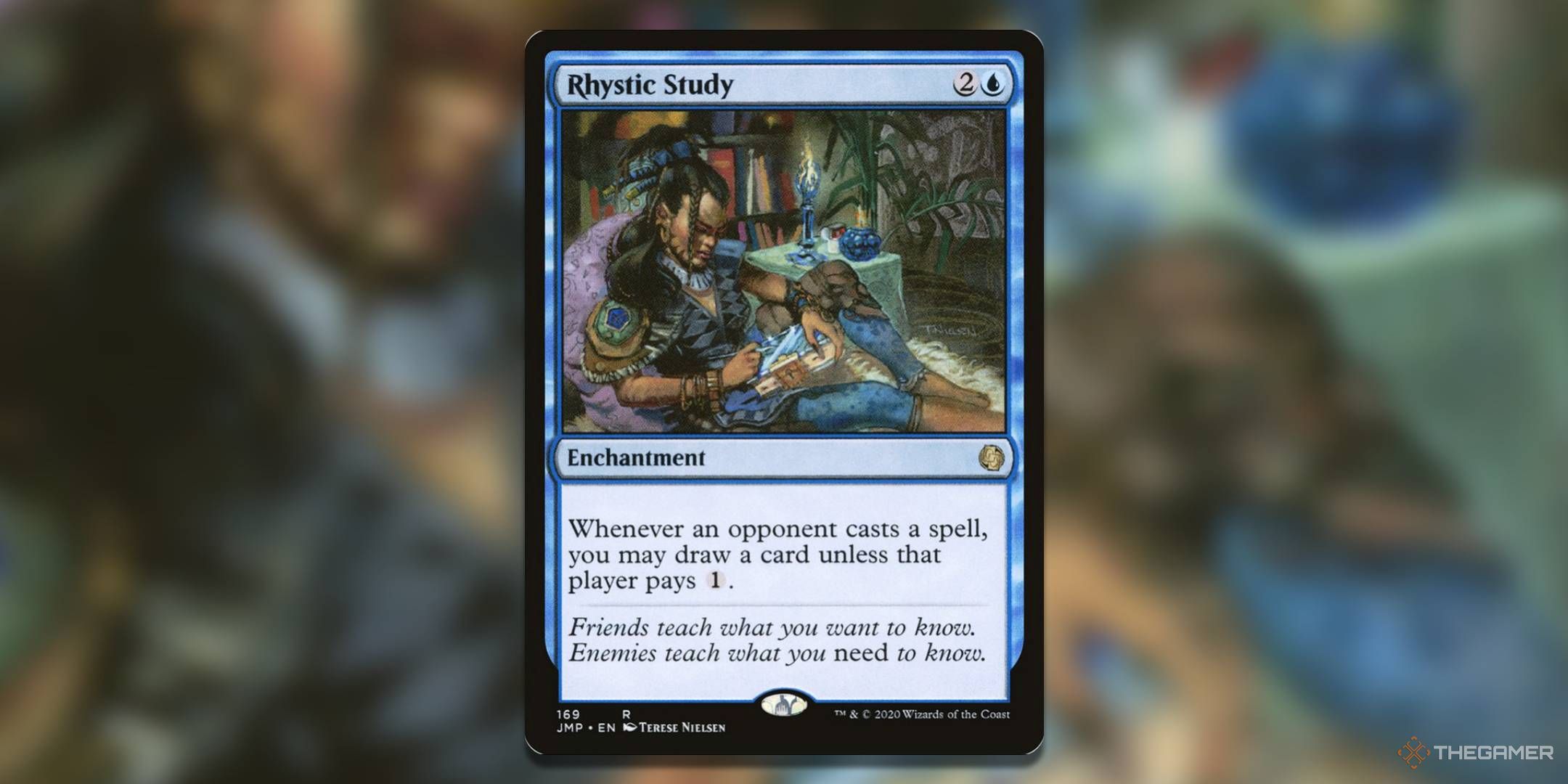 魔法の中で:収集する根症の研究は、信じられないほど強力な青いエンチャントカードです。わずか3マナのコストが低く、それをプレイしている人のために税と引き分けの両方として機能します。これは、継続的な能力が原因であるため、相手が1つのマナ税を支払わない限り、相手が呪文を唱えるたびにカードを描くことができます。