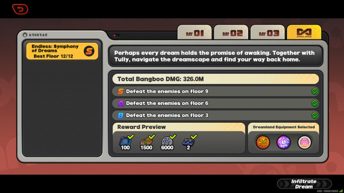 エンドレスチャレンジと以前の3つの挑戦の主な違いは、夢の交響曲の各ラウンドがタイミングが合っていることです。敵の分野をクリアするために90秒があります。そうしなかった場合、アクティビティはすぐに終了し、到達した最後のフロアに基づいて評価されます。再試行したい場合は、最初から開始する必要があります。