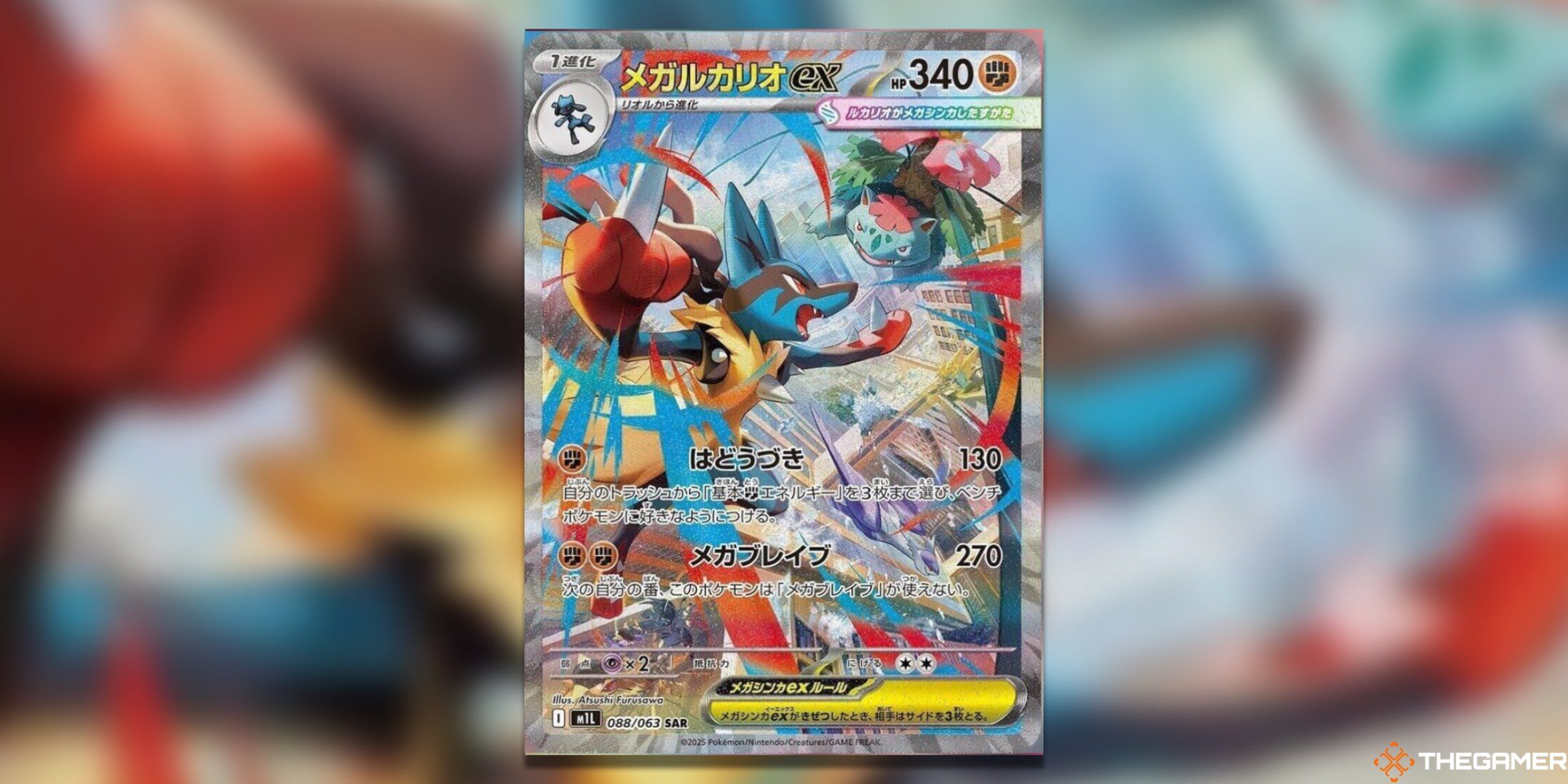 メガブレイブの主要なチェイスカードは、このアートワークが細部と明るい背景に注意を払っているおかげで、メガブレイブとメガシンフォニアで最高のSARSのバーを上げます。メガ・ルカリオはスターですが、ルカリオのHP値の下で、遠くに見られるメガ・ヴェヌサウルスと忙しいキャンバスのいくつかを共有しています。