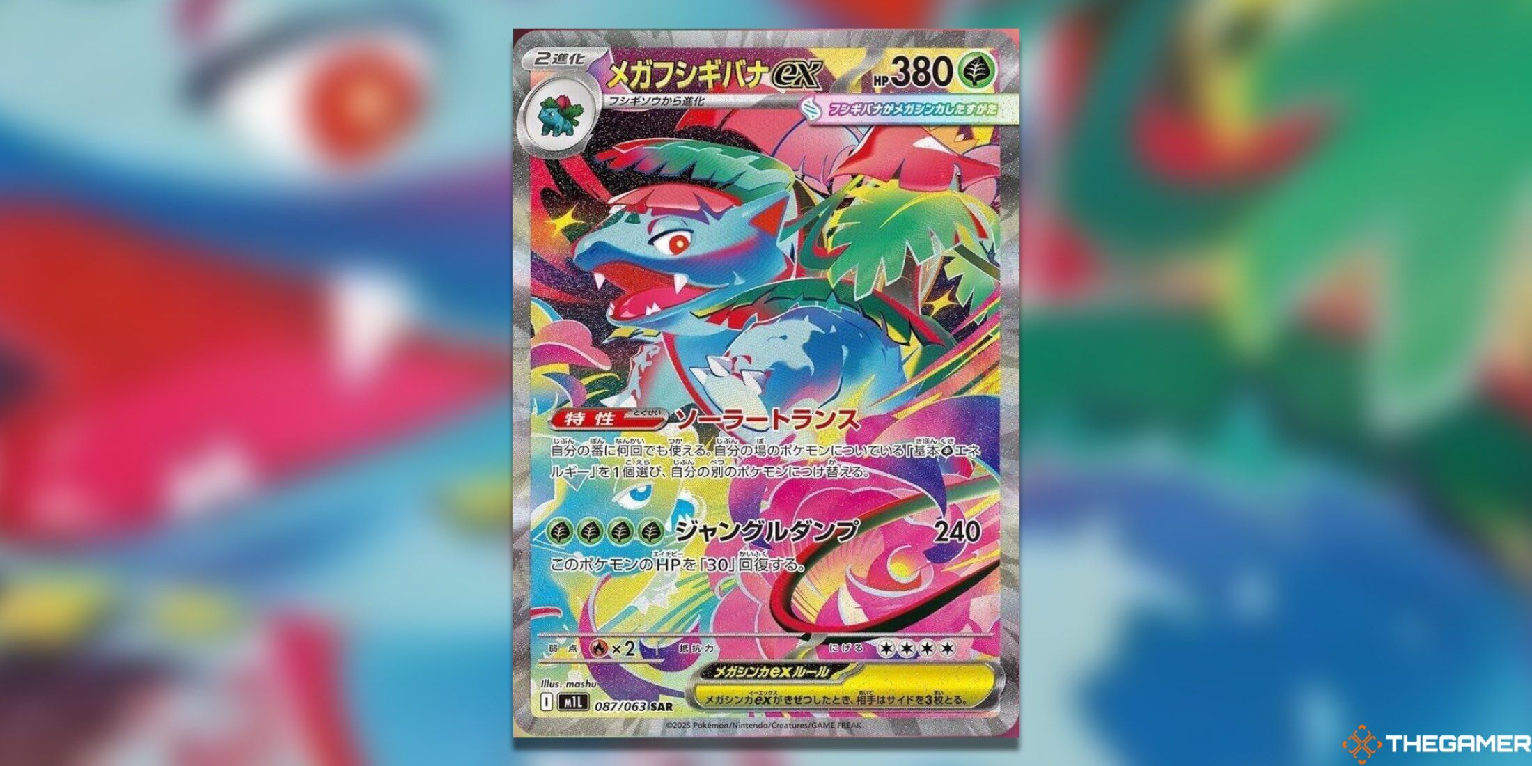 Mega Venusaurは、メガブレイブまたはメガシンフォニアで最も明るいアートワークの1つとして称賛されており、この壮大なアクションショットでは青と緑のカラーパレットから際立っています。カードのテキストの背後にある領域を検査すると、攻撃するドラゴナイトの輪郭がVenusaurに向かって舞い上がります。