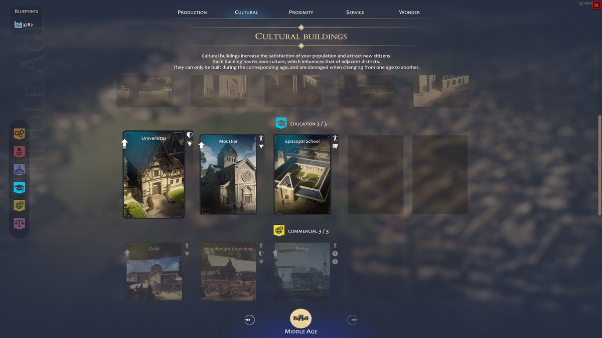 各文化はゲームにその位置を占めていますが、特にメモリポリスの早期アクセスの場合、それらのすべてが等しく利用されているとは限りません。教育文化は、ノウハウ(図書館)の建物を通じて大きな影響を与えますが、中世の終わりに近づいているときにのみアクセスできるようになり、それが早期アクセスの終わりでもあります。