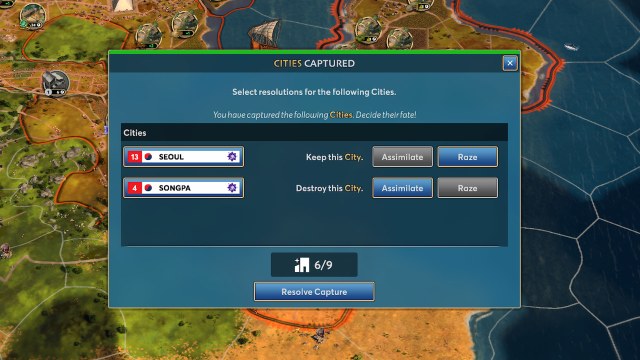 都市がすべての健康ポイントを失ったとき、占領されます、そして、あなたはそれを同化するか、それを破壊することを決定することができます。