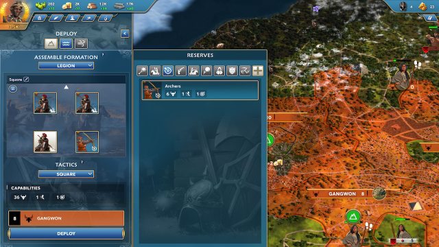 この画面はあなたがどこにいるかです作成した力を展開します。最初は、1つのユニットのみで構成される分隊のみを展開できます。マップに展開する訓練されたユニットを選択し、それらがスポーンする都市を選択します。