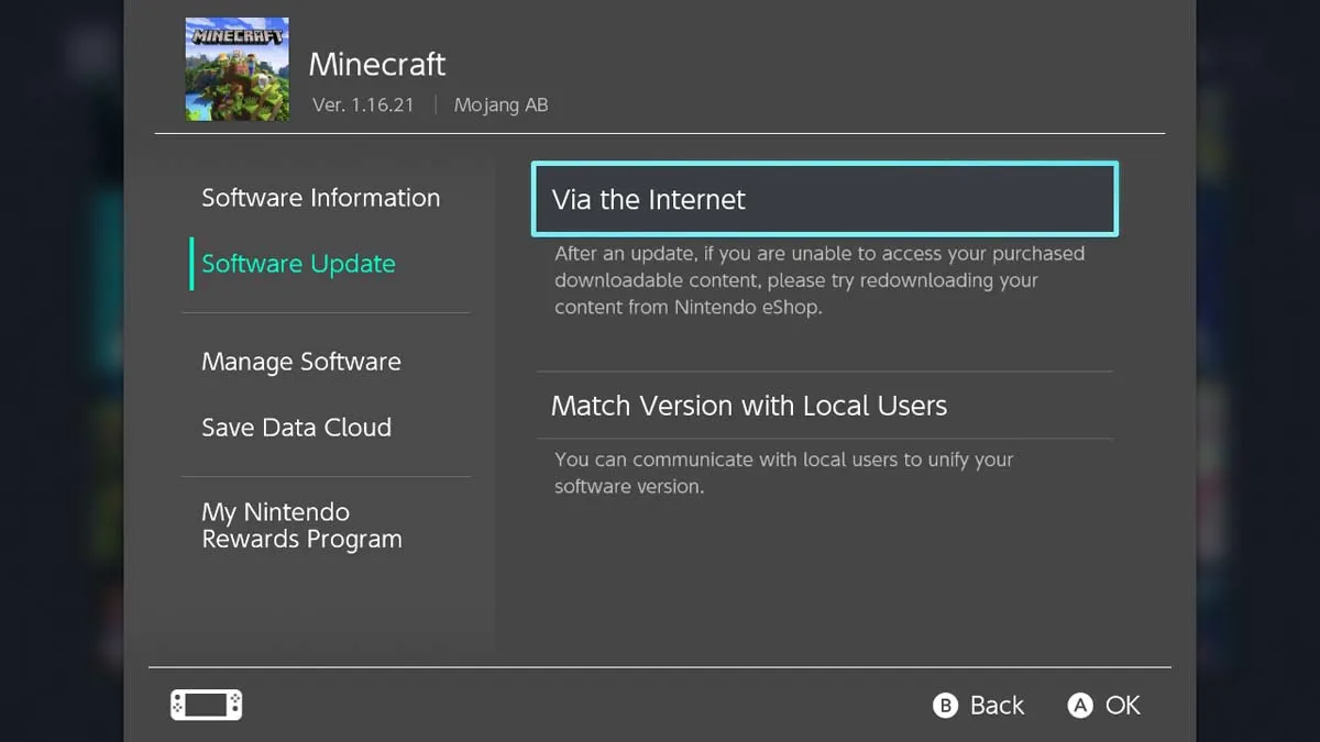 スイッチで、ゲームのリストのMinecraftアイコンを強調表示し、 +ボタンを押します。そこから、「ソフトウェアアップデート」を選択し、次に「インターネット経由」を選択します。更新がある場合、自動的にダウンロードします。