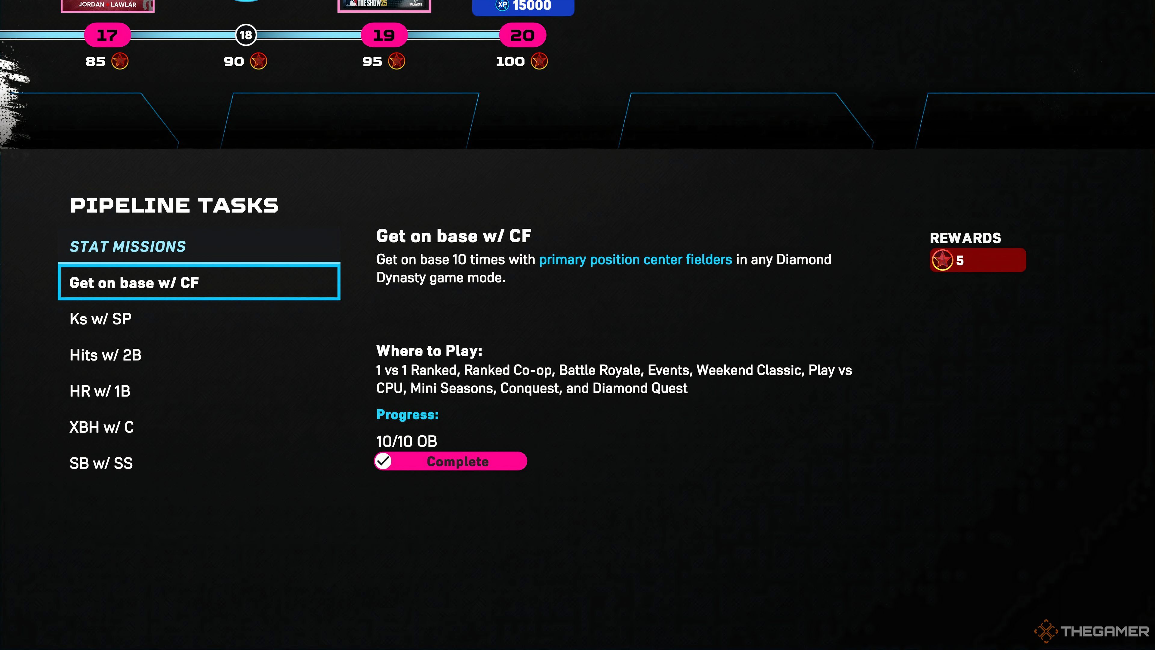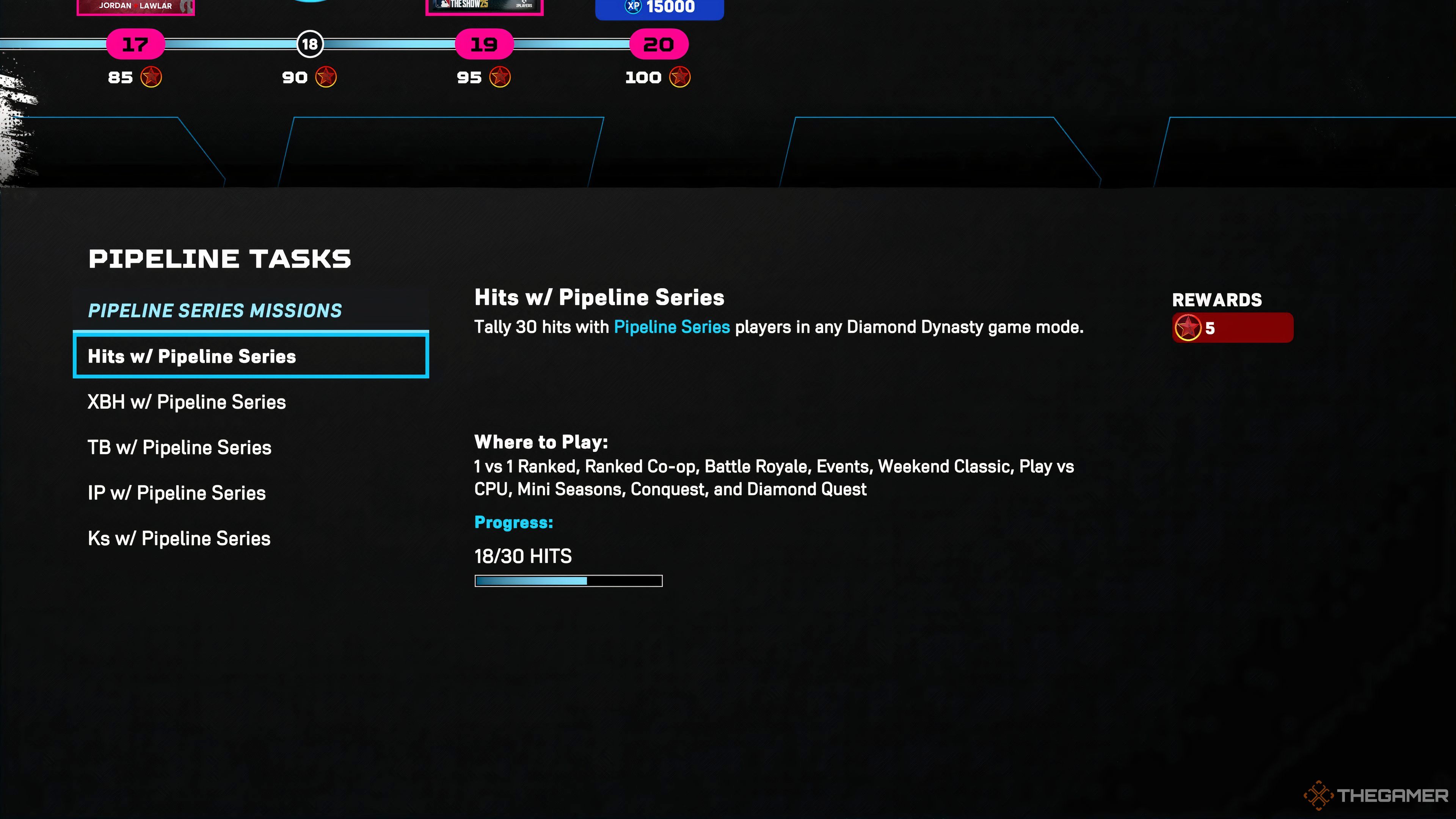 XBH w/ pipelineシリーズ | すべてのダイヤモンド王朝モードでパイプラインプレーヤーと15のエクストラベースヒットを取得する | 5 |