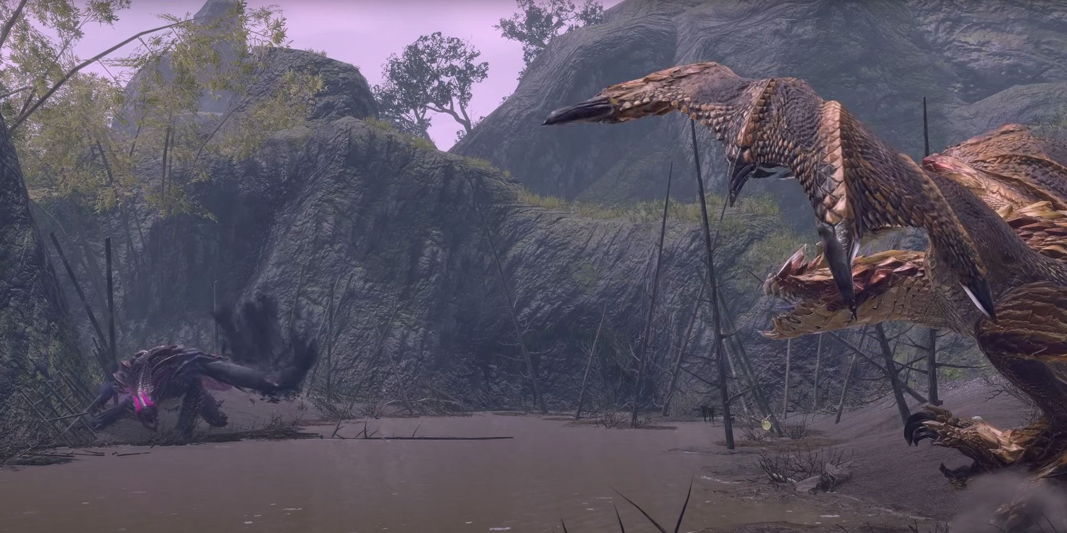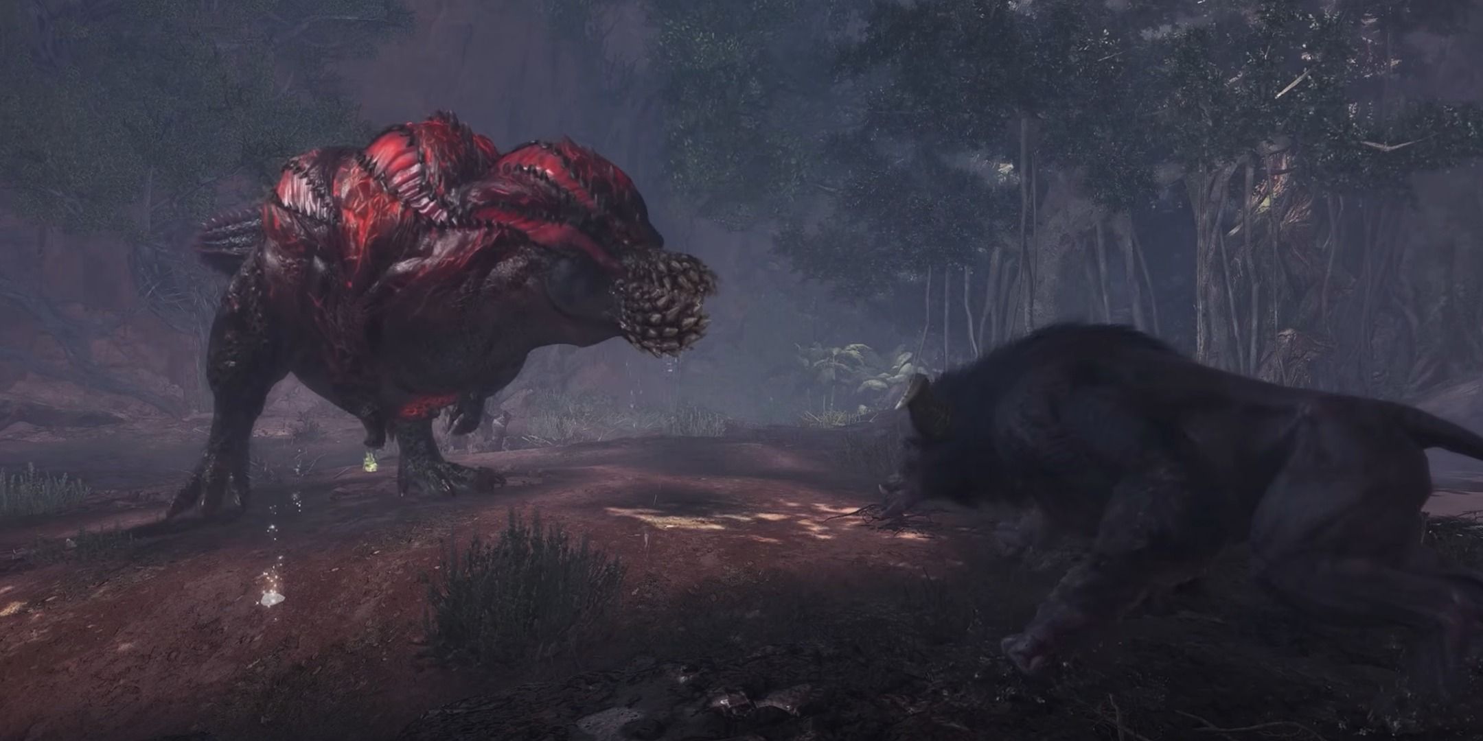 モンスターハンターの他の分割払いでは、これを2人のモンスター間のカットシーンの相互作用と見なすことができ、多くの場合、彼らが自分の種類に攻撃的でさえあることを紹介します。 Monster Hunter:Worldでは、これを(通常)通常のディアブロと黒いバリエーションの間の芝生の戦争として見ることができます。衝突に勝つ人は誰でもしばしばランダム化されますが、より攻撃的なバリアントが勝利する可能性があります。