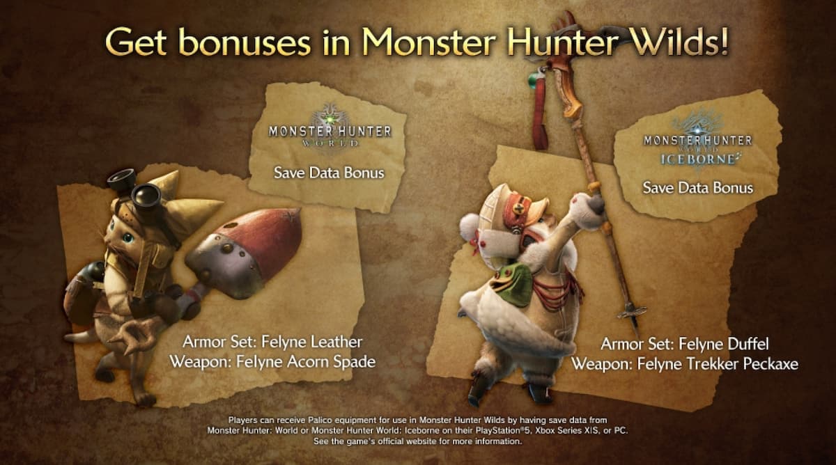 それだけでなく、ワイルドは、モンスターハンターワールドとそのDLC拡張であるIceborneをプレイしている場合、Palico Palsのクールなギアでプレイヤーの忠誠心を報酬を与えます。ただし、ワイルドでプレイするのと同じプラットフォームで、以前のゲームとそのDLCからデータを保存する必要があります。