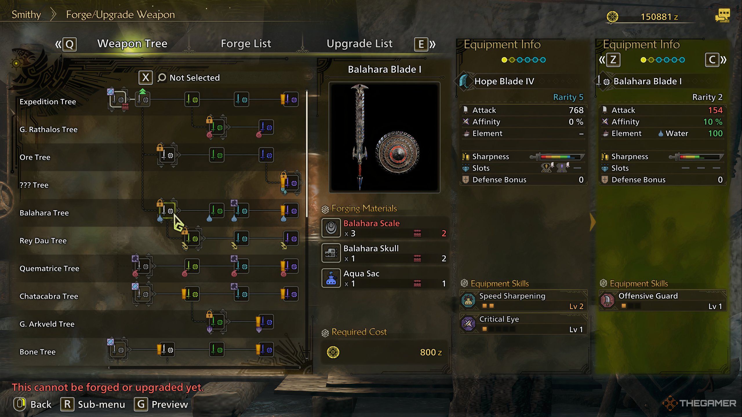 低い材料として、アクア嚢あなただけを許しますレアリティ4ギアまで。ただし、ほとんどの高品質の武器では、低識別バージョンを使用する必要があります。それは意味します希少性5以上の武器が必要な場合、 必要がある最初に弱いものを作成しますAqua Sacsのような素材を使用して作成します。