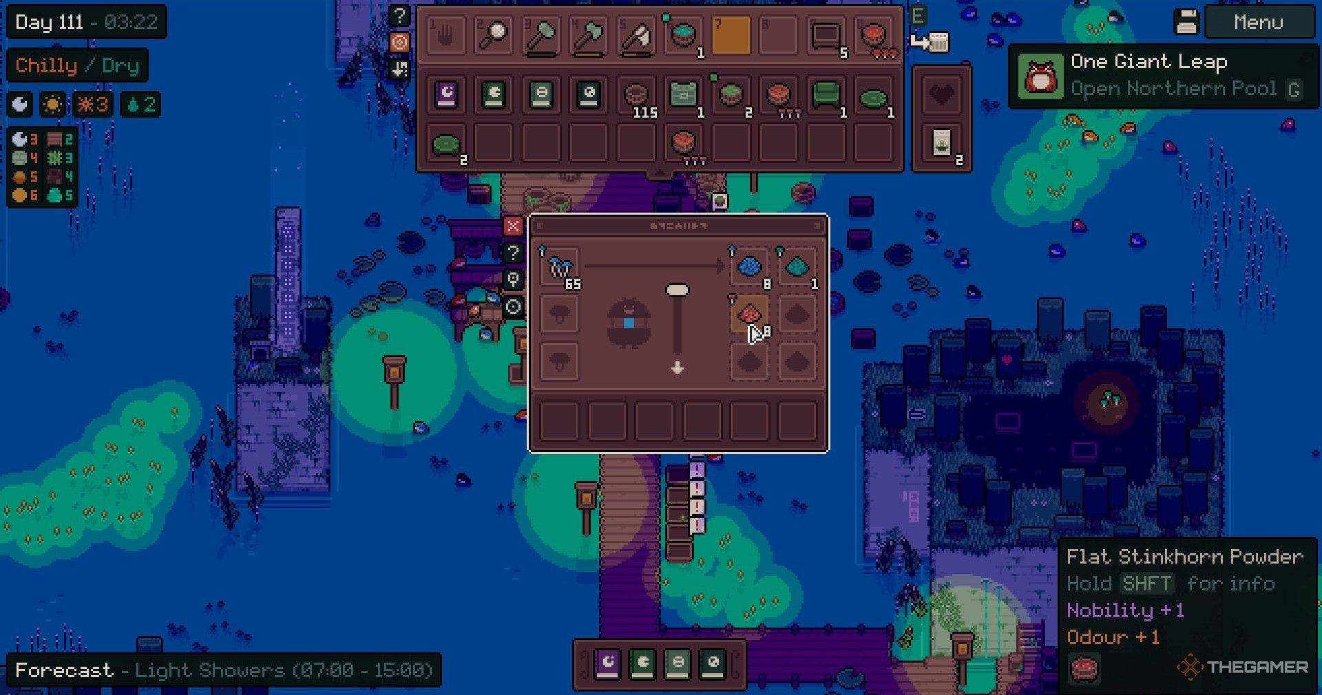 繁殖時にカエルの特性を次世代に変えるには、池の周りに育ったキノコの品揃えから作られた特定の種類の泥でオタマジャクシを育てる必要があります。各キノコは、それが粉砕されて上記の泥に置かれたときに1つか2つの特性を修正し、そこから成長するカエルはそれに応じてその特性を変えます。それは、効果を掛けたり抑制したりするマッシュルームにセグリングする前に、完全に「プラス1」または「マイナス1」モディファイ因子で十分にシンプルから始まります。ボーナス:あなたが数学的に傾いている場合、答えはあなたにとって画面上で大丈夫です。