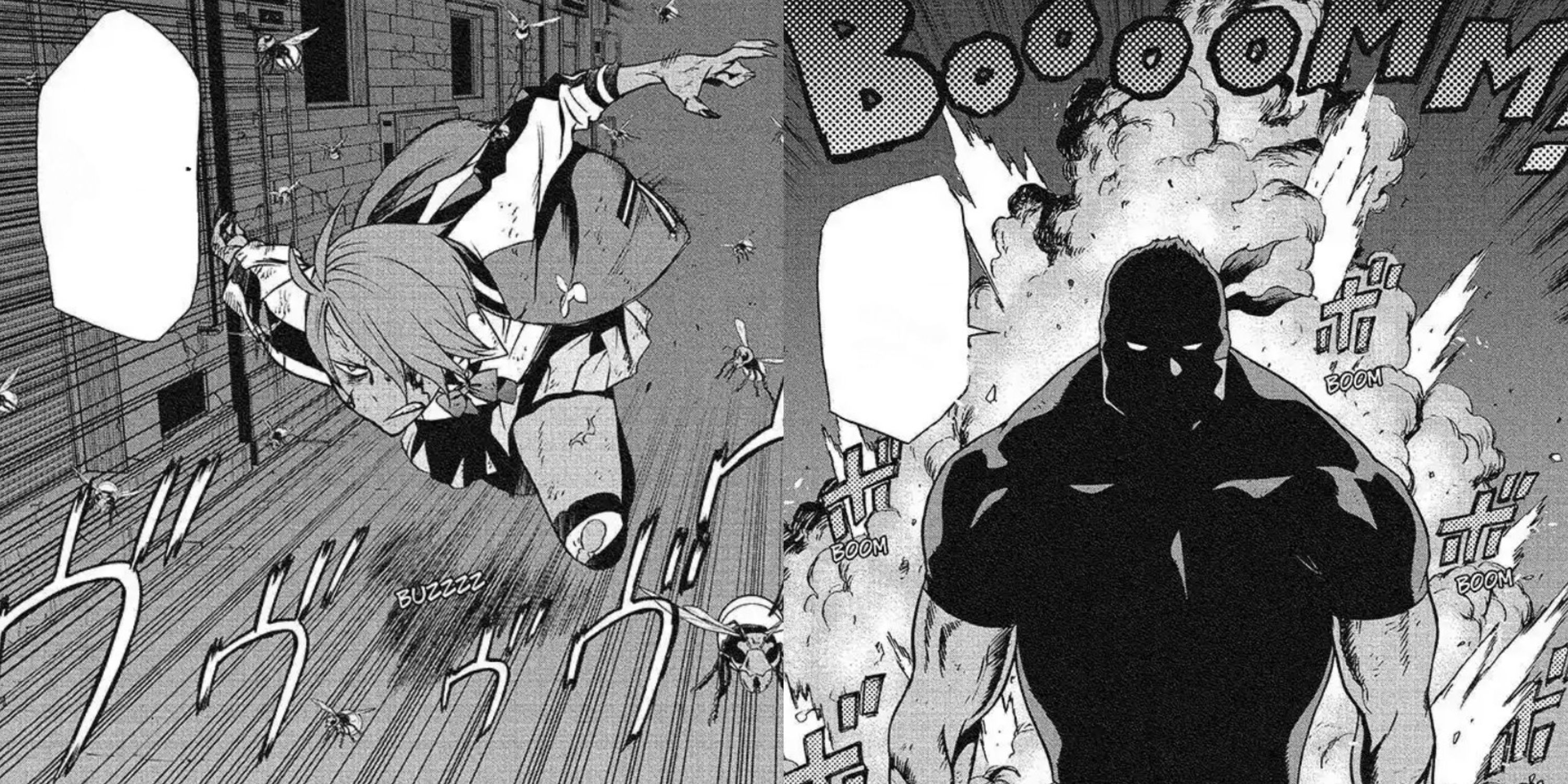 小島は彼女を追いかけ、ミツバチのポップが彼女の爆弾ミツバチを解き放ち、彼を押しのけます。ナンバー6は、傍観者からすべてを見ており、介入するプロヒーローを殺しています。しかし、カズホは彼女の心を支配した状態を通り過ぎて、小島に手を伸ばすことができますが、6番で胸を撃たれるだけです。