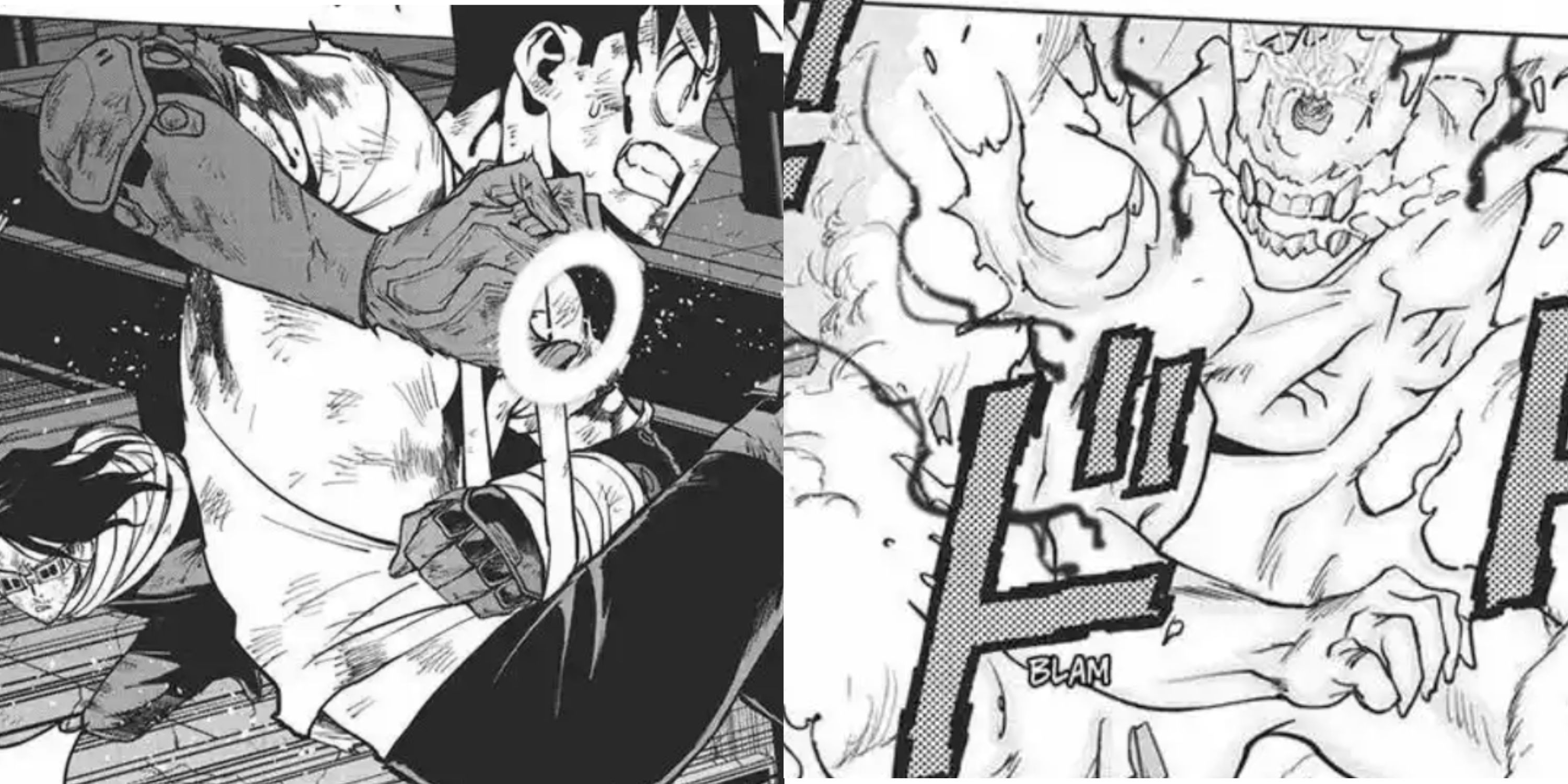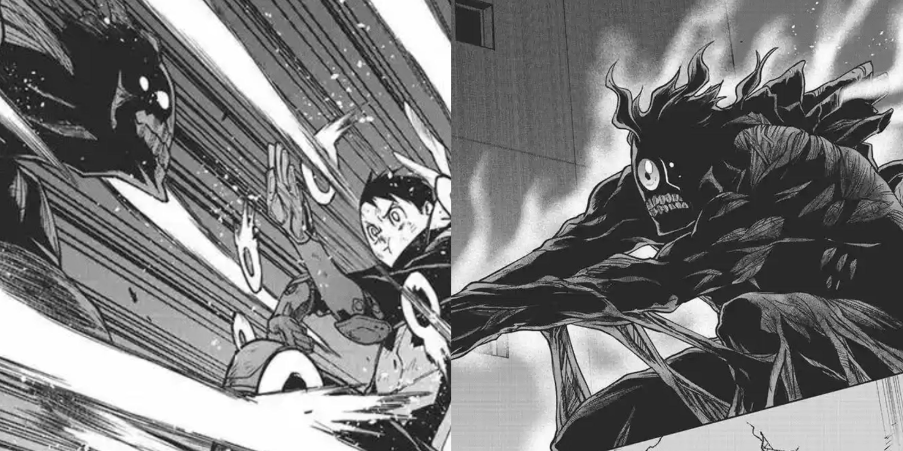 漫画全体の最終的な戦い、この長くて激しい衝突により、彼の「破壊形式」を想定して6位になりました。これにより、小島は重傷を負いましたが、彼は他のプロヒーローと一緒に戦い続けています。