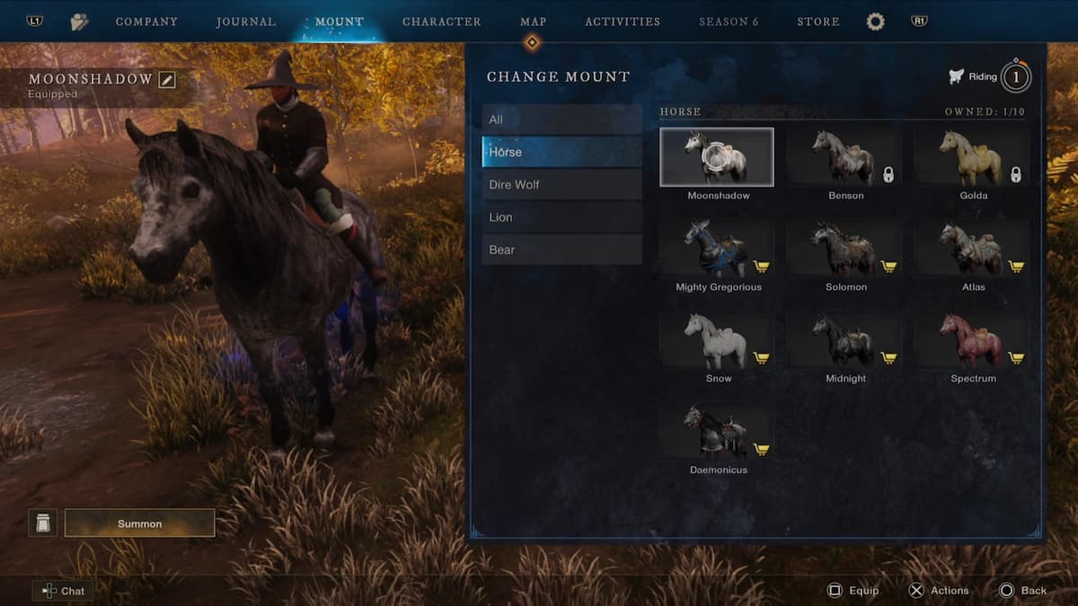 マウントメニューには、4種類のマウント、つまり馬、悲惨なオオカミ、ライオン、クマが4つの異なるタイプがあることがわかります。