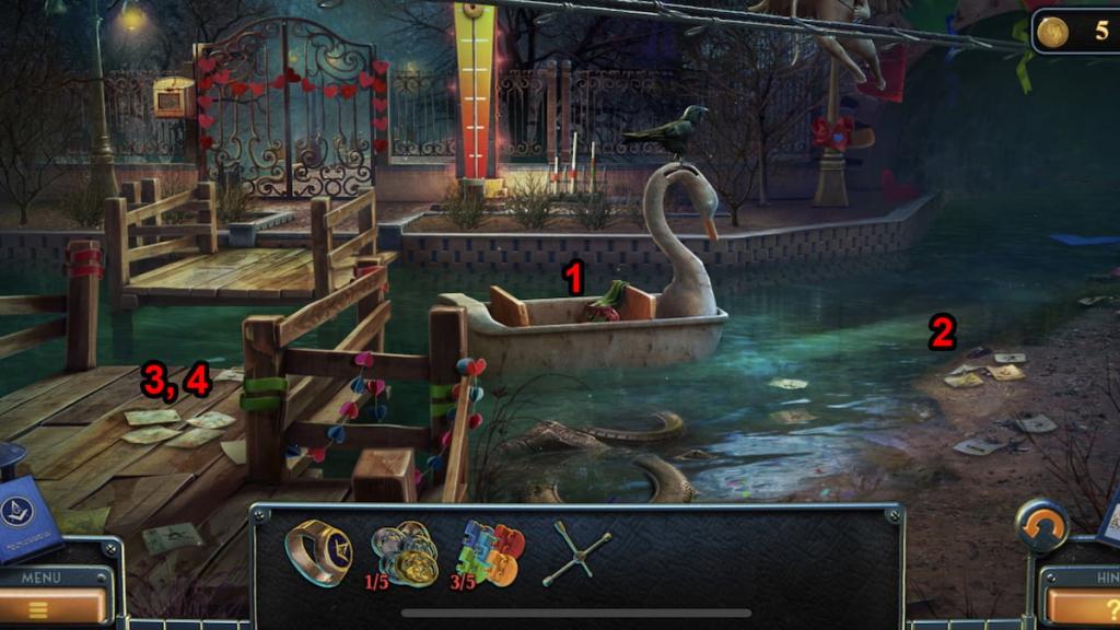 まず、右側のエリアから始めます。画面の右側をタップして、川と白鳥のボートのあるエリアに入ります。ここから、以下の手順を使用して、最初のパズルセットを解決できます。