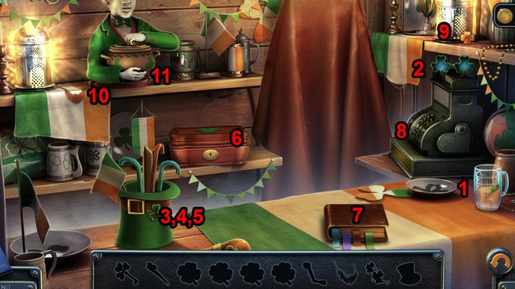 初期のステップの多くは、パズルを発見することにつながりますが、まだそれらを解決することはできません。代わりに、ロックを解除したドアから始める必要があります。そこでは、聖パトリックの日をテーマにしたアイテムを見つける必要があります。取得する必要があるオブジェクトの完全なリストは次のとおりです。