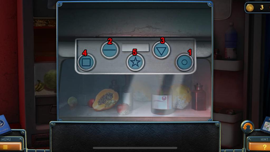5つのボタンすべてができたので、冷蔵庫の上部をタップして挿入します。それらを押す正しい順序は、形状の線の数に依存します。要するに、押す必要があります円、線、三角形、正方形、星。エリアを開くと、収集します硫酸ナトリウム溶液そしてベンゼン先に進む前に。