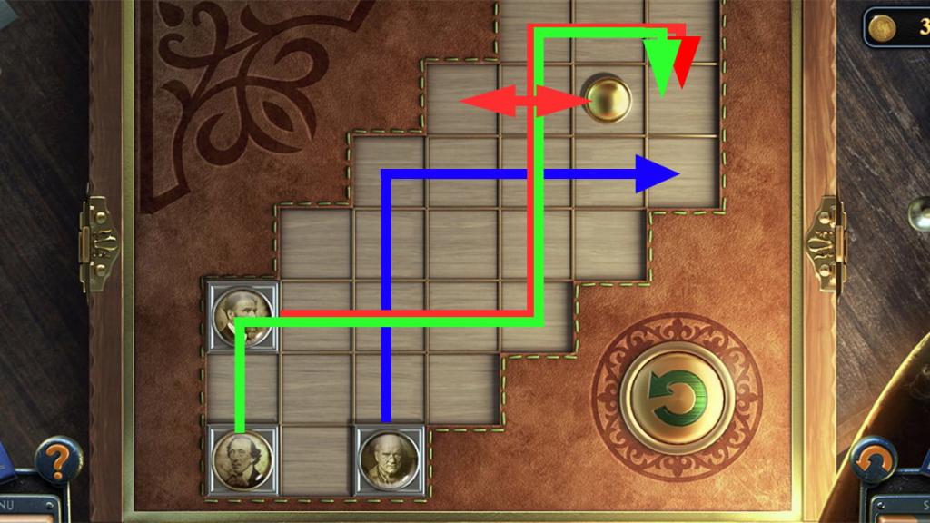 この点へのパズルは難しいものでしたが、これは非常に簡単に立ち往生できる最初のものです。円の左側と右側にある2つの矢印ボタンを押すと、それを回転させ、ボールがパスを転がすことができます。以下は、このパズルを解決するために必要なシーケンスです。