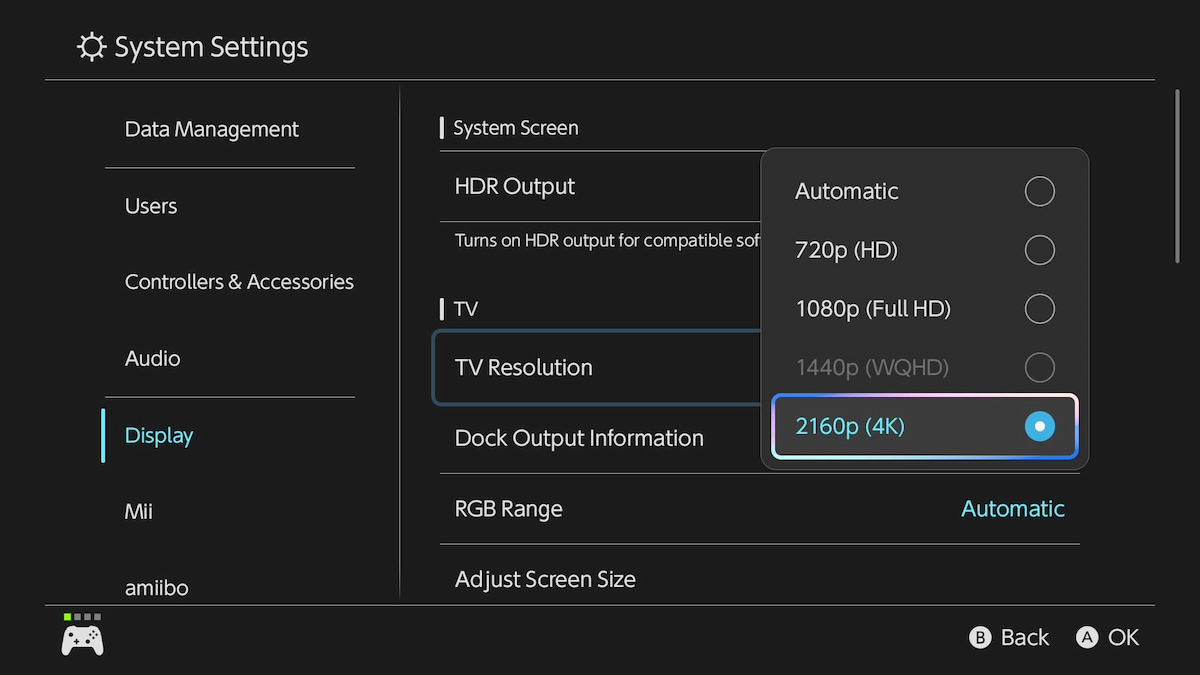 スイッチ2は、720p、1080p、1440p、および2160p(4k)で表示できます。ただし、高解像度を選択しても、テレビが正しく表示されていない場合があります。ディスプレイが4K対応であることを確認してください。4K対応のHDMIケーブル(スイッチ2には1つに付属)、設定で4Kが選択されていることを確認してください。