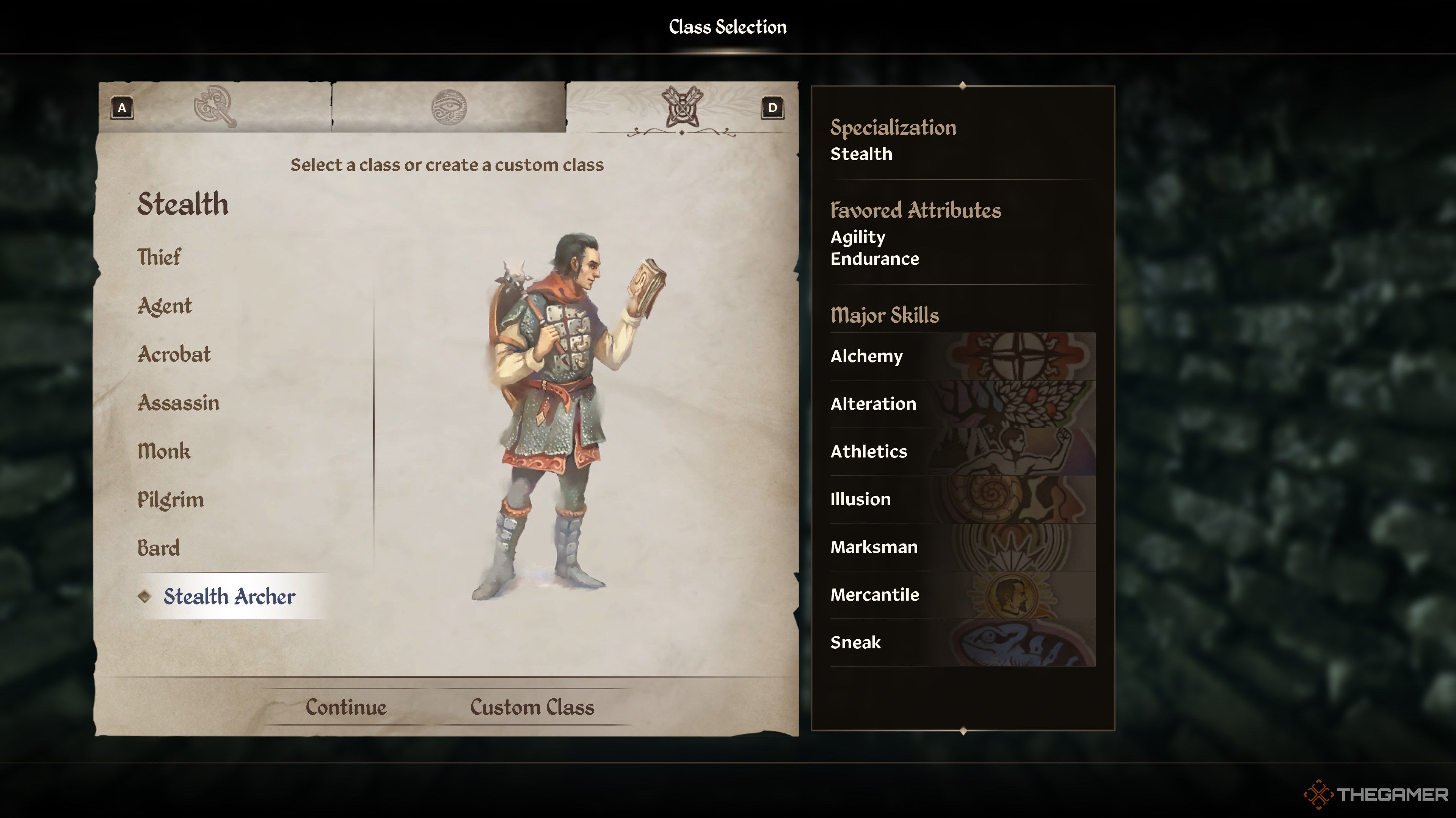 クラスを作成するときは、しなければなりませんステルスを専門化しますマークスマンに+5を獲得し、スキルをこっそり。属性は、ほとんどが好みにかかっていますが、お勧めします敏ility性そして持久力それぞれ弓のダメージとHPをわずかに後押ししてください。