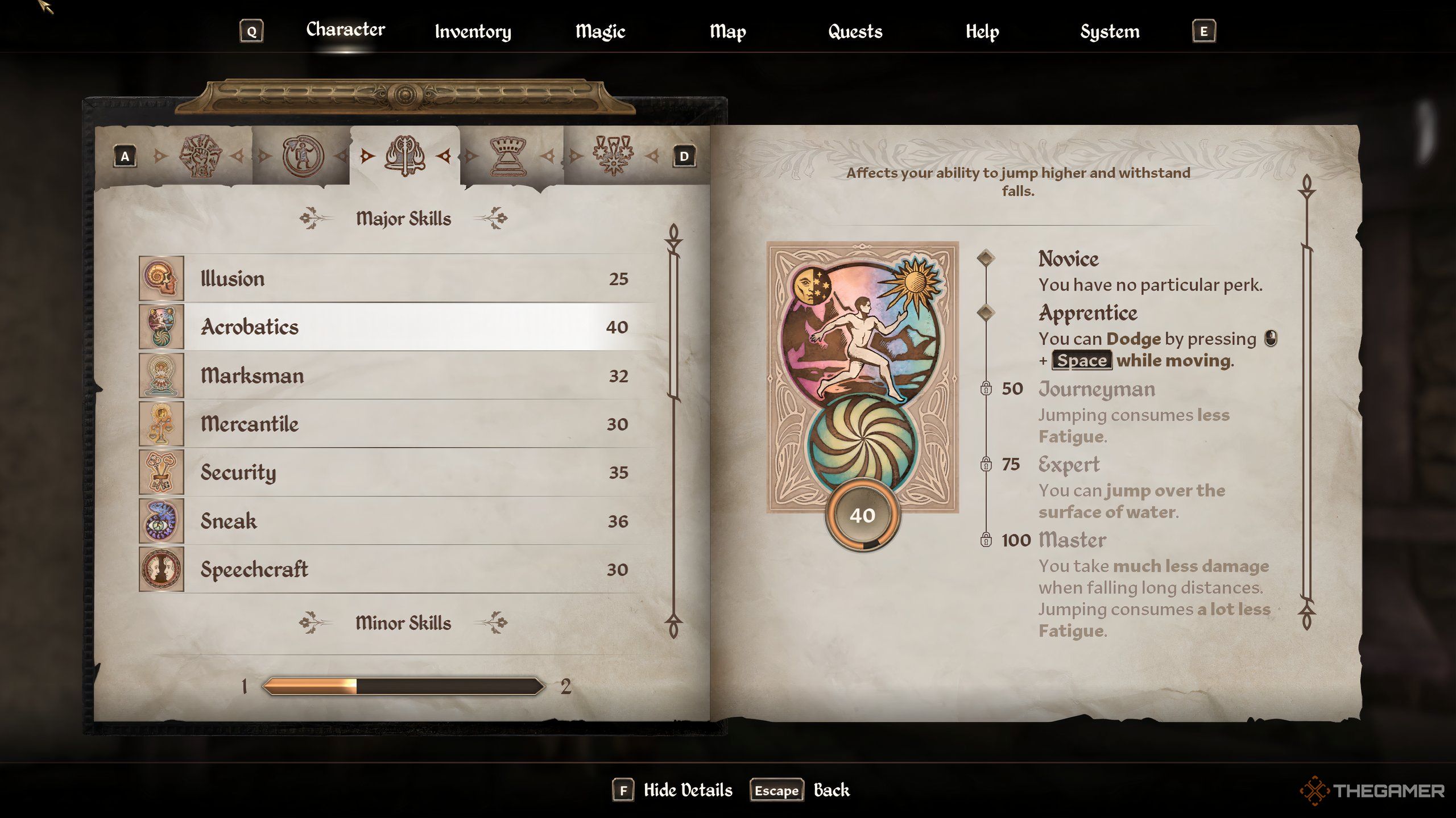 アクロバットは、キャラクターの動きを制御するため、忘却の最も重要なスキルの1つです。ウォーキングやスプリントから水泳まですべてがこのスキルに依存します。これが、アクロバットを主要なスキルにするのが賢明な理由であるため、急速に増加します。さらに、歩行やジャンプなどの自然な行動とともにアクロバットが増加するため、より速くレベルアップすることができます。