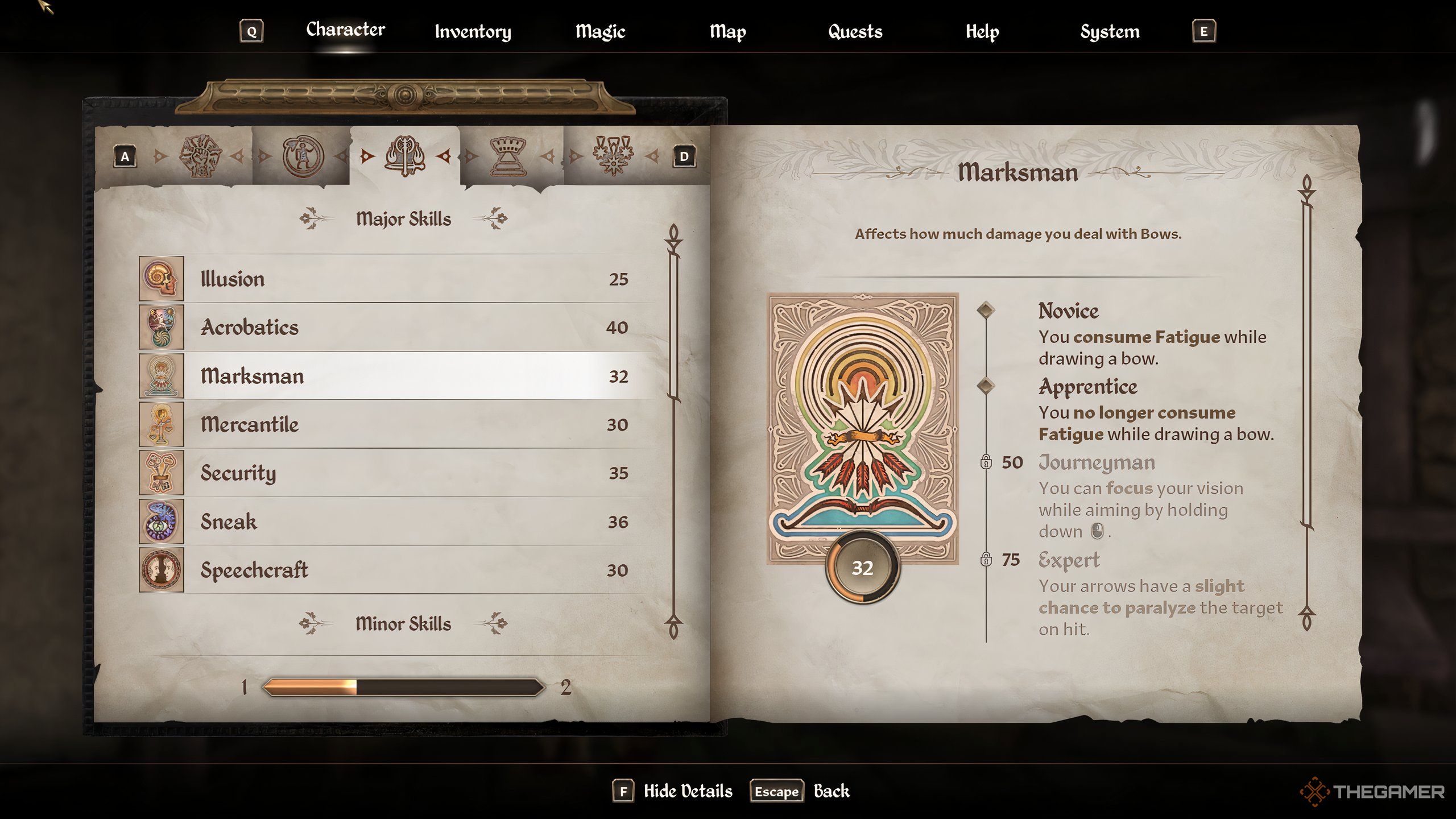 遠隔の武器を使用して敵を殺さなければならないので、スキルを高めることは十分に簡単です。マークスマンスキルが必要なものである場合、それを主要なスキルとして持っていることは賢明です。マイナーなスキルとして、マークスマンは殺害を増やして増やすことができます。敵を麻痺させるチャンスをすべての矢に与えたい場合は、すぐにレベルアップしたいと思います。